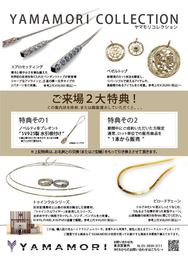 この度、創業80年の老舗ジュエリーメーカーの株式会社山森製鎖(所在地:富山県富山市、取締役社長:村田敬昭)は、東京ビッグサイトにて1月15日~18日で開催される第36回国際宝飾展(以下IJT2025)に出展します。展示会では、世界初の石留工法「エアロセッティング」をはじめ無限の広がりを表す新シリーズ「Connect」、煌めく素材「twinkle(トゥインクル)」、世界初の貴金属水引「YAMAMORI MIZUHIKI」、などの総数100型に及ぶ新作を発表・出展いたします。