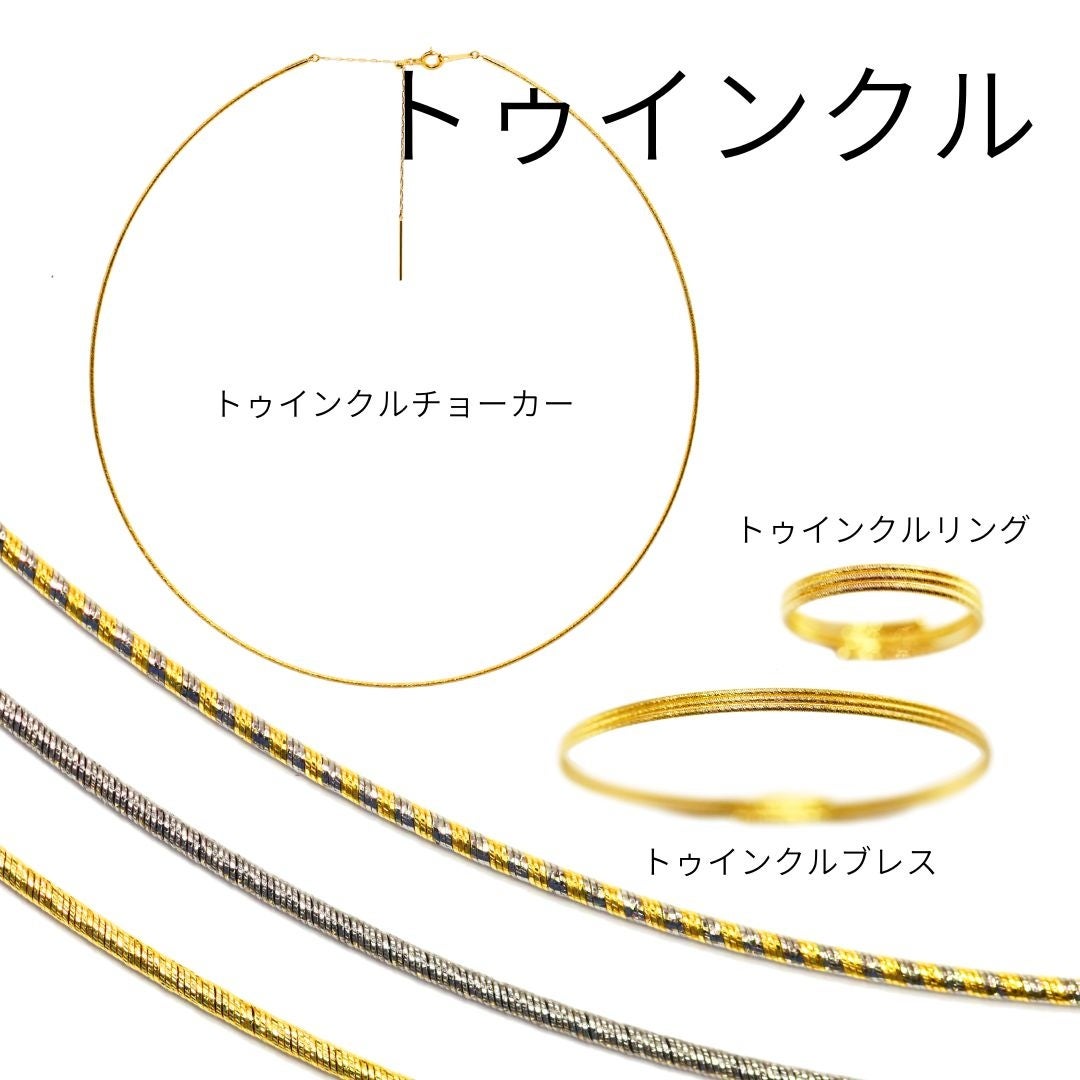 「Twinkle = 煌めく、キラキラ輝く、きらきら星」 形状記憶素材にYAMAMORI独自の加工を施して生まれた新素材「トゥインクルワイヤー」を使用した商品です。 オリジナルの製法により、K18、Ptはもちろん、ありそうでなかったK18 x Ptのコンビも展開しております。 ワイヤーの表面は、山森のカット技術を駆使し、細やかで上品な輝きをプラス。形状記憶系の商材にありがちな、ゴテゴテした雰囲気を払拭しております。 リングやバングルはフリーサイズとなっておりますので、サイズが合うものがないとお悩みのエンドユーザー様にもおすすめして頂きやすい作りになっています。