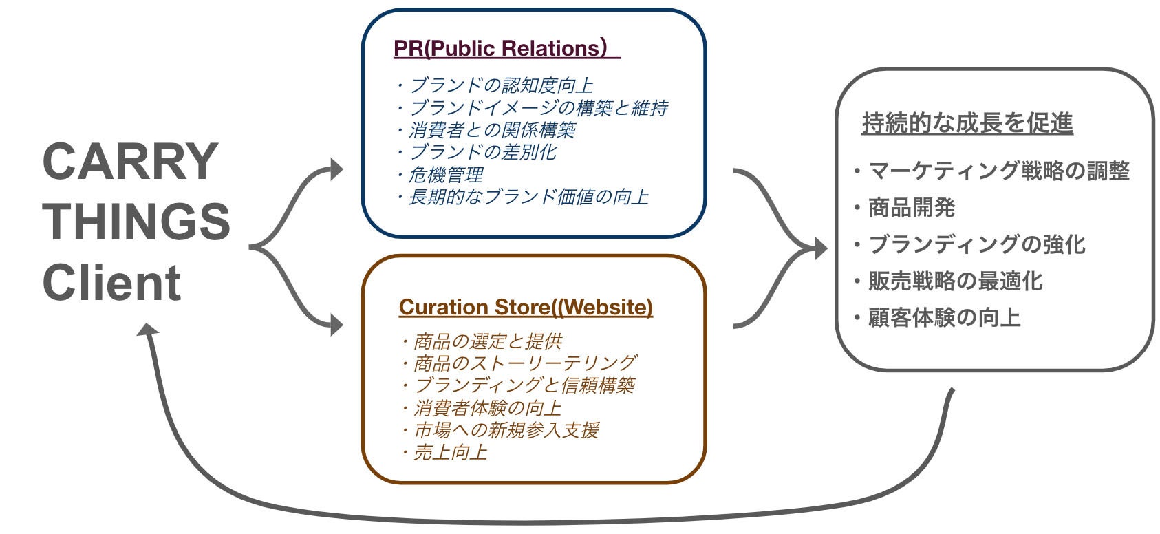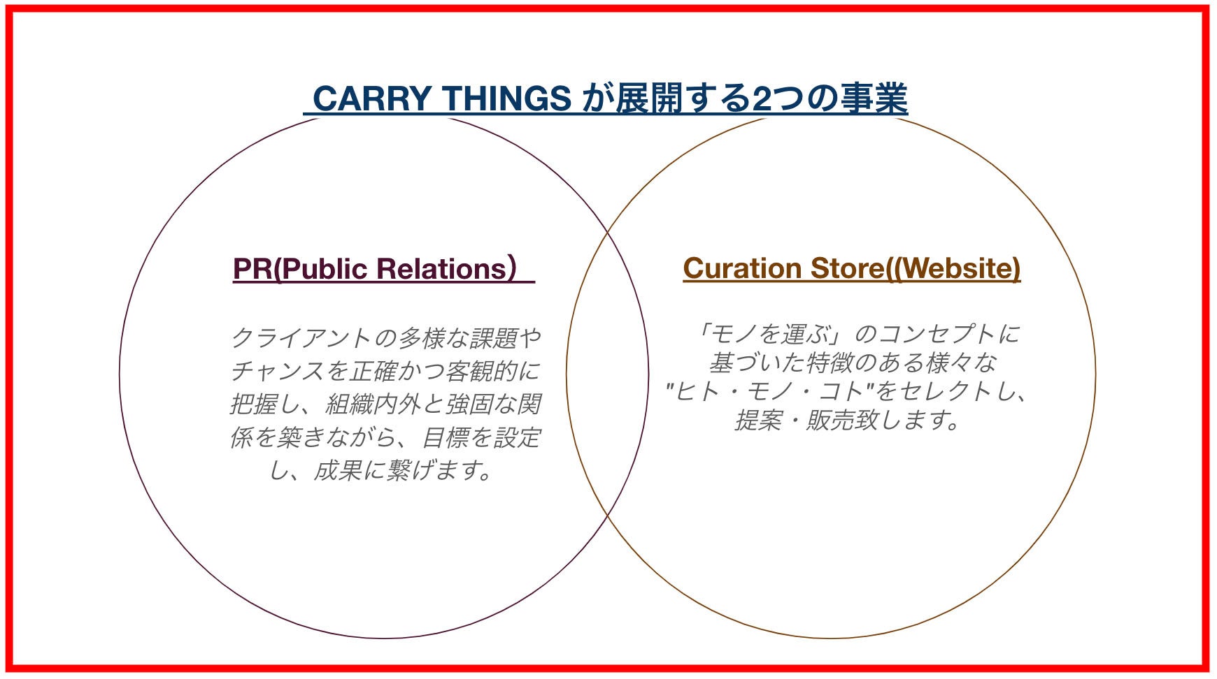 私たちCARRY THINGSは「モノを運ぶ」をコンセプトにしたPR(Public Relations)事業と、キュレーション ストアと名付けたEC事業の2つを連携して運用していきます。