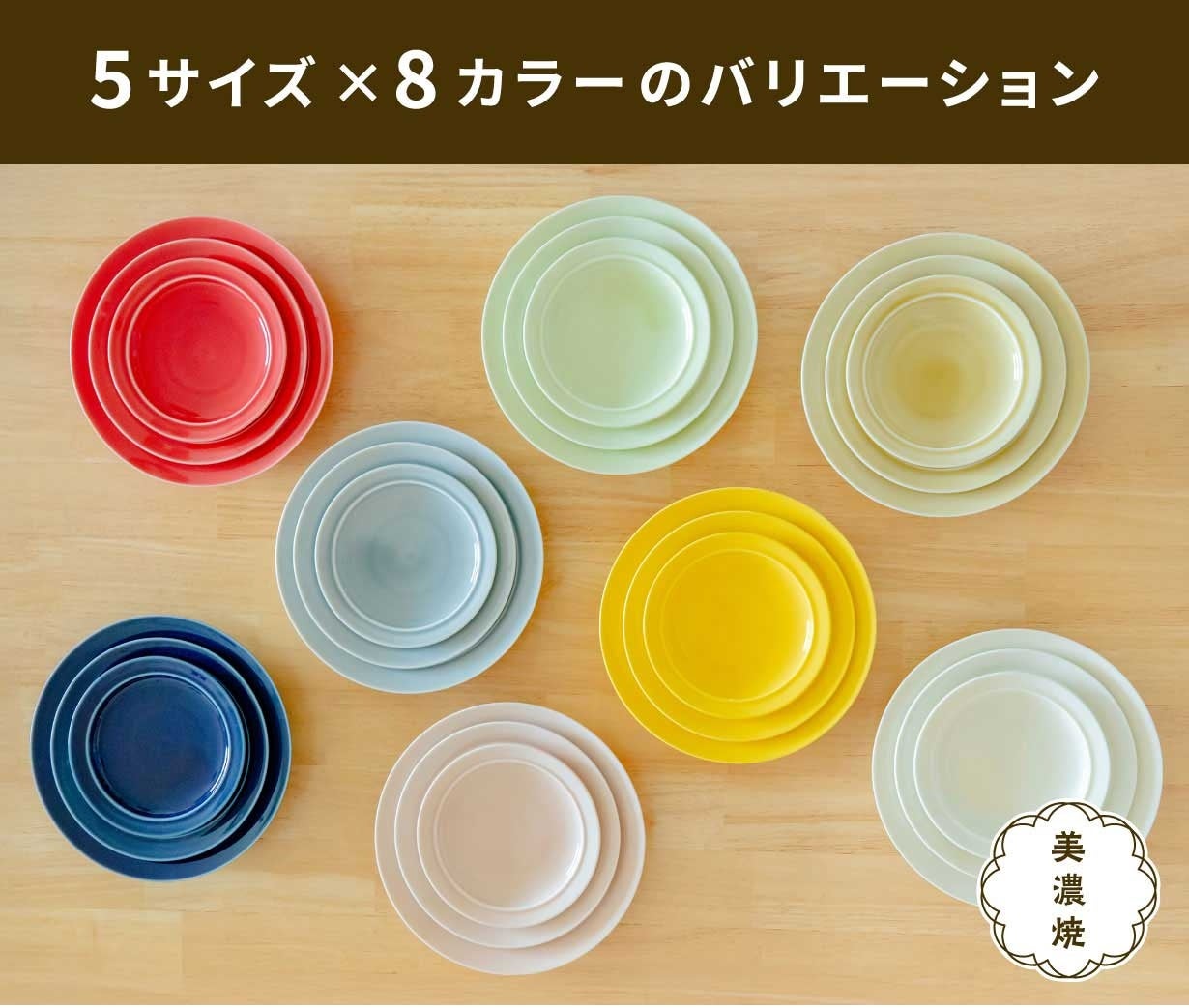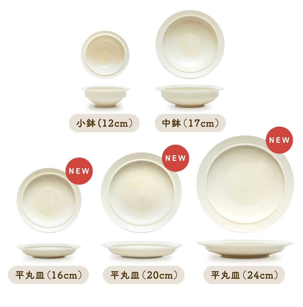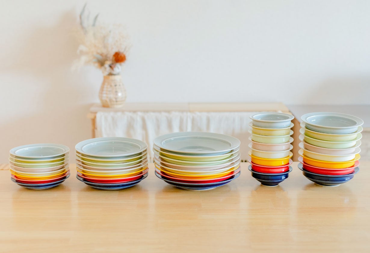 前作の「SUKUSUKU」は、9カラー、2サイズの展開でしたが、第2弾となる今回は、カラフルなカラー展開は全8色(オフホワイト、イエロー、レッド、ネイビー、ブルーグレー、ライトキャメル、ライトグリーン、ピンク)とそのままに、食器のサイズのバリエーションが5サイズに拡充しました。小鉢(12cm)、中鉢(17cm)、平丸皿(16cm)、平丸皿(20cm)、平丸皿(24cm)と様々なサイズの食器を取り揃えることで、こどもと大人が一緒に使える食器に進化しました。