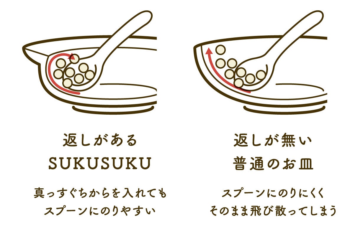 「SUKUSUKU」は「すくいやすい」×「すくすく育つ」という2つの意味を込めて開発された食育用食器です。「SUKUSUKU」は、子育ての悩みの中から生まれました。こどもは1歳を過ぎて来ると、食事も手掴みから徐々にスプーンの練習が始まります。ただ、こどもにとって、スプーンを使って上手く食べ物をすくうのは難しいもの。そこで「SUKUSUKU」は器の上部に「返し」を設けることで、握りながらしかスプーンが使えなくても、お皿のカーブに沿って自然と食べ物をすくえるような形状になっています。また、器の上部に返しがあるため、勢い余って食べ物を飛び散らせる事も減ります。他に、こどもの食事で頭を悩ませるのが「食べこぼし」です。「SUKUSUKU」では、食器のリムを広めにつくることでテーブルに食べこぼしが落ちにくいように工夫しています。「すくいやすいお皿」を通して、食に興味を持ち、自分でどんどん挑戦する好奇心を育んでほしい。「SUKUSUKU」は、こうしたこどもへの願いが込められた商品となっています。