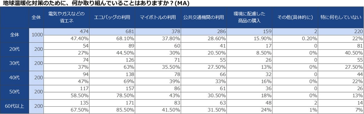 この結果から、多くの人が地球温暖化問題を意識し、日常生活の中でできることから取り組んでいる様子がうかがえます。特に、エコバッグの利用は手軽に始められることから、広く普及していると考えられます。しかし、まだ具体的な行動に移せていない人も一定数いることから、より多くの人が参加できるような取り組みや啓発活動が必要であると考えられます。また、年代別に見た場合、40代以上の世代は環境問題への取り組みを積極的に実施していることがうかがえるが、30代以下の世代についてはあまり環境問題を意識していないことがわかった。