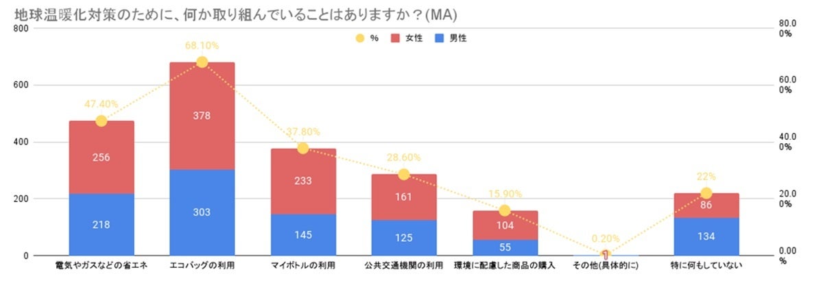 地球温暖化対策として個人で取り組んでいることを示しています。最も多くの人が取り組んでいるのは「エコバッグの利用」であり、全体の68.1%を占めています。次いで「電気やガスなどの省エネ」が47.4%、「マイボトルの利用」が37.8%となっています。一方、「特に何もしていない」と回答した人は22%でした。