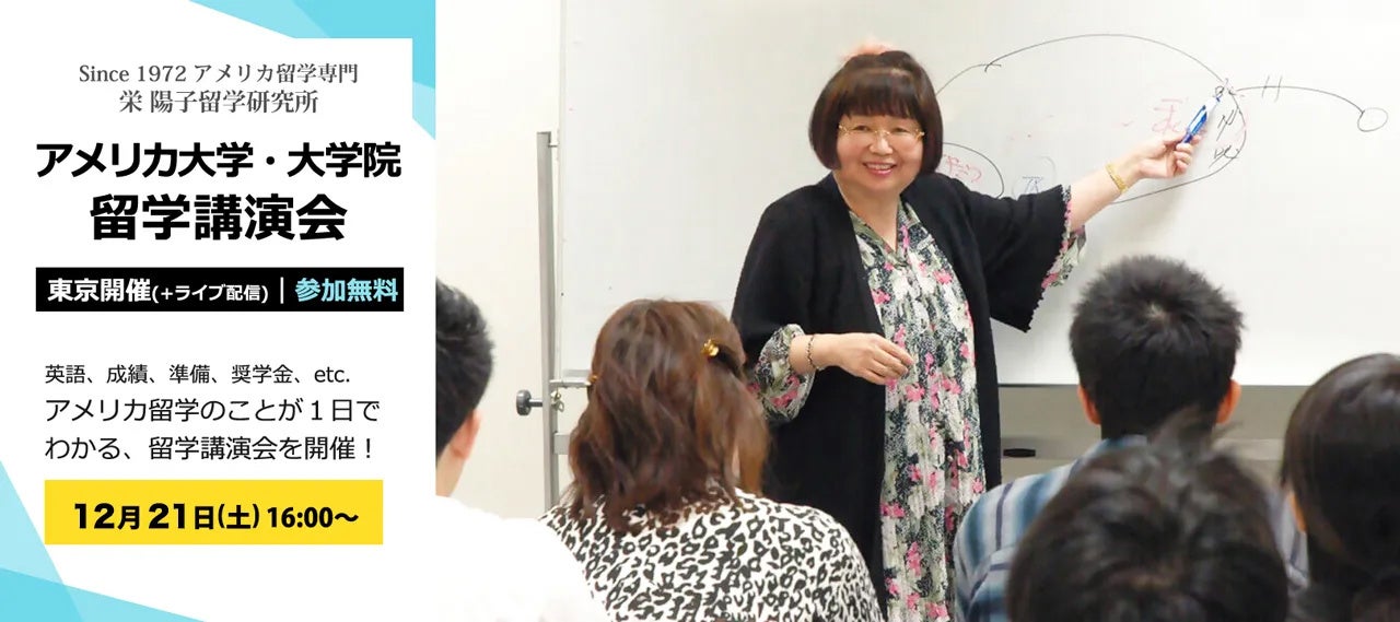 50年以上にわたってアメリカの大学・高校・大学院への留学をめざす人を応援してきた栄 陽子留学研究所(東京都港区)は、「アメリカ大学・大学院留学講演会」を12月21日(土)に開催します。この講演会は、アメリカの大学・大学院への留学に興味を抱いている人を対象として、栄 陽子がユーモアたっぷりに「留学のリアル」をお話しするものです。長期にわたる留学においては、正しい情報を見きわめ、人生の大きな転換点として留学を位置づける視点が欠かせません。2025年からアメリカでの大学生活をスタートさせたいという人は、ぜひこの講演会に参加して、自分にとって最もふさわしい留学の第一歩を踏み出してください。