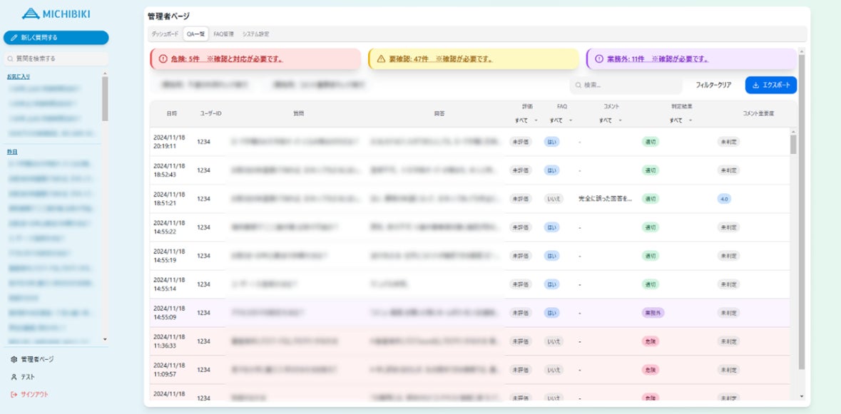 ユーザーの業務外利用や危険な内容を含む質問などを生成AIで検知。検知した場合は管理者にアラートで通知。アラートを活用することで安全な運用体制の整備が可能。