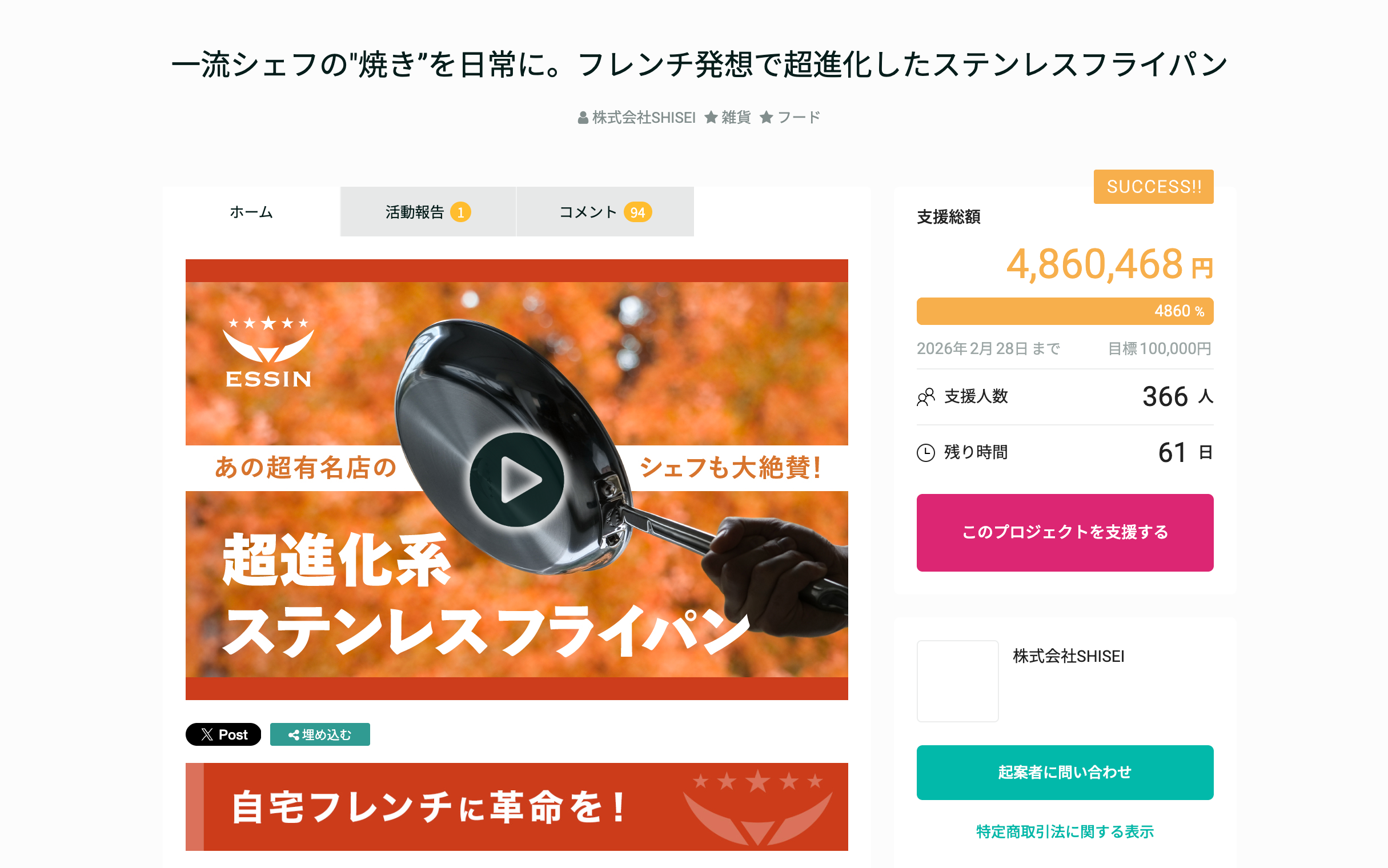 【公開72時間で支援486万円/目標4,860%突破】一流シェフの“焼き”を日常へ。次世代ステンレスフライパンESSIN、先行プロジェクト開始