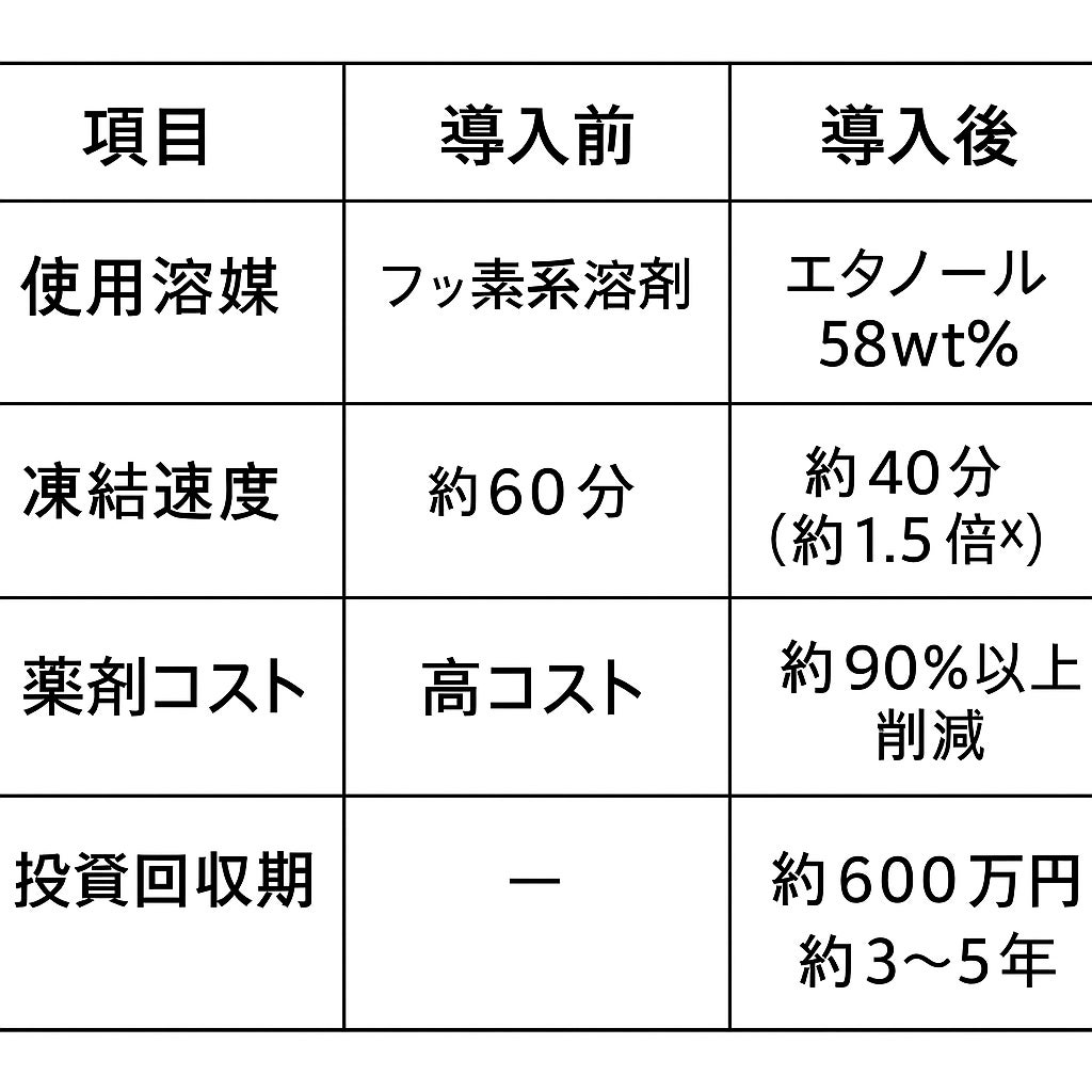 本導入により、金管楽器の氷曲げ工程において年間約600万円の薬剤コスト削減と約1.5倍の凍結速度向上を実現し、品質と生産効率の両立を達成しました。