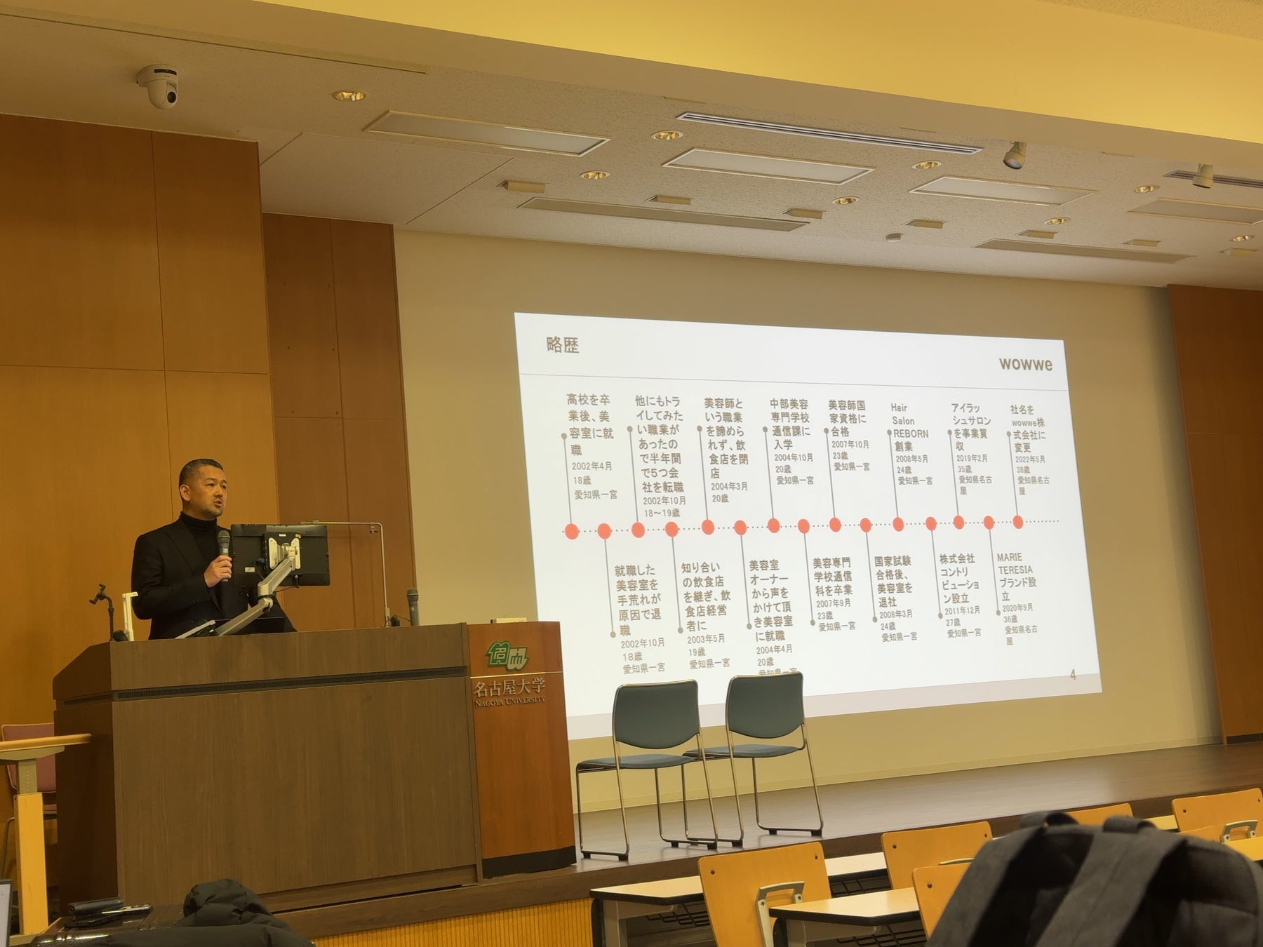 アイラッシュに特化した美容サロンを運営するベンチャー企業、wowwe株式会社(本社:愛知県名古屋市、代表取締役:虫鹿正敏)は2025年1月23日、名古屋大学経済学部で開催された特別講演にて代表の虫鹿がお招きいただき、学生に向けて起業の魅力や課題について講演する機会をいただきました。
