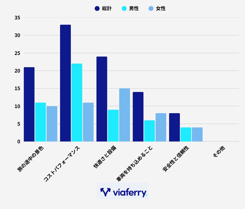 フェリー選びの決め手として「コストパフォーマンス」を最重視する男性は42.3%で、女性の22.9%を大きく上回りました。一方で、「快適さと設備」を最重視する女性は31.3%に達し、男性の17.3%を上回っています。