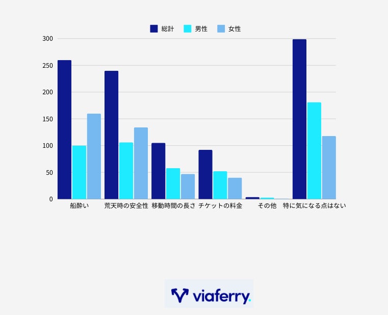 全体として、船酔いと安全性に関する懸念が上位を占めました。特に、女性の32.0%が船酔いを最も懸念しており、男性の20.0%を大きく上回っています。一方で、「特に懸念はない」と回答した男性は36.2%にのぼるのに対し、女性はわずか23.6%にとどまりました。