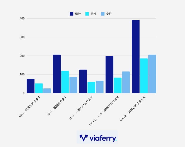 回答者全体のうち、少なくとも一度はフェリーを利用したことがある人は41%にのぼりましたが、性別による差が際立っています。何度もフェリーを利用したことがあると回答した男性は23.8%(500人中52人)であるのに対し、女性はわずか5.0%(500人中25人)にとどまりました。