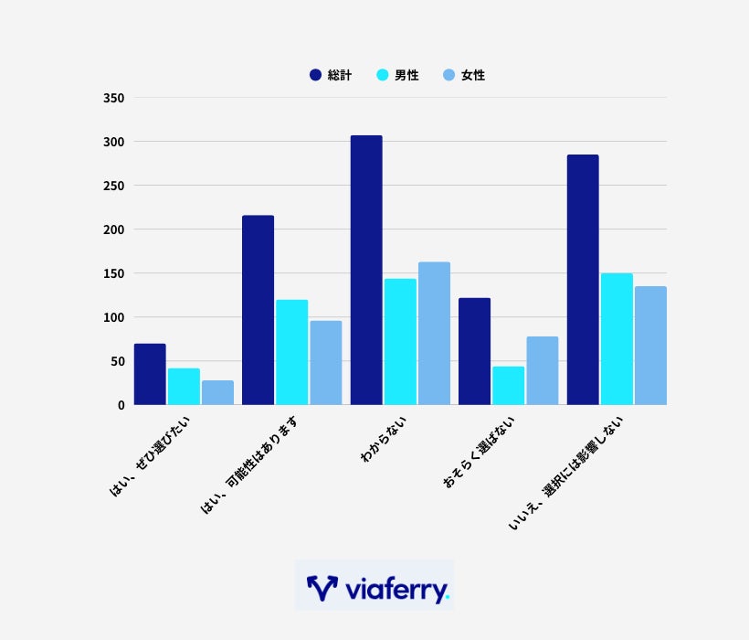 再度フェリーを利用したい、または非常に利用したいと回答した男性は57.7%であるのに対し、女性は45.8%が「わからない」と回答し、躊躇する層(主に女性)にどう訴えかけるかが課題であることがわかります。 -