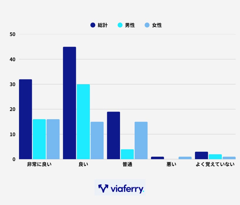 「非常に良い」または「良い」と過去のフェリー体験を評価した男性は88%にのぼるのに対し、女性は65%にとどまりました。一方で、「普通」と答えた女性は31%で、男性のわずか7.7%と大きな差が見られました。この結果は、サービスの質や船内の快適性が、特に女性の期待を十分に満たしていない可能性を示唆しています。