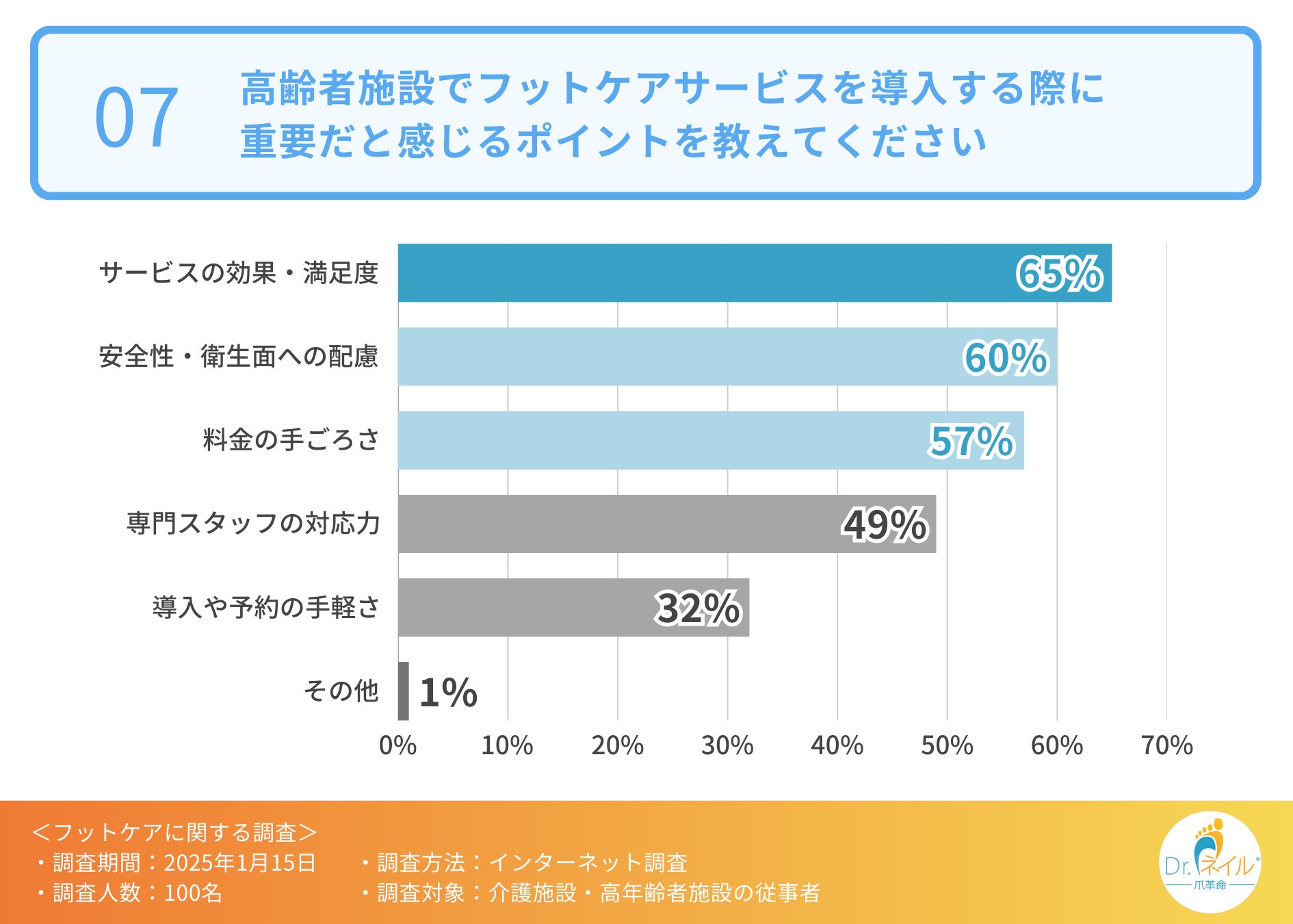 そこで、高齢者施設でフットケアサービスを導入する際に重要だと感じるポイントについて伺ったところ、「サービスの効果・満足度(65.0%)」「安全性・衛生面への配慮(60.0%)」「料金の手ごろさ(57.0%)」「専門スタッフの対応力(49.0%)」という回答が集まりました。