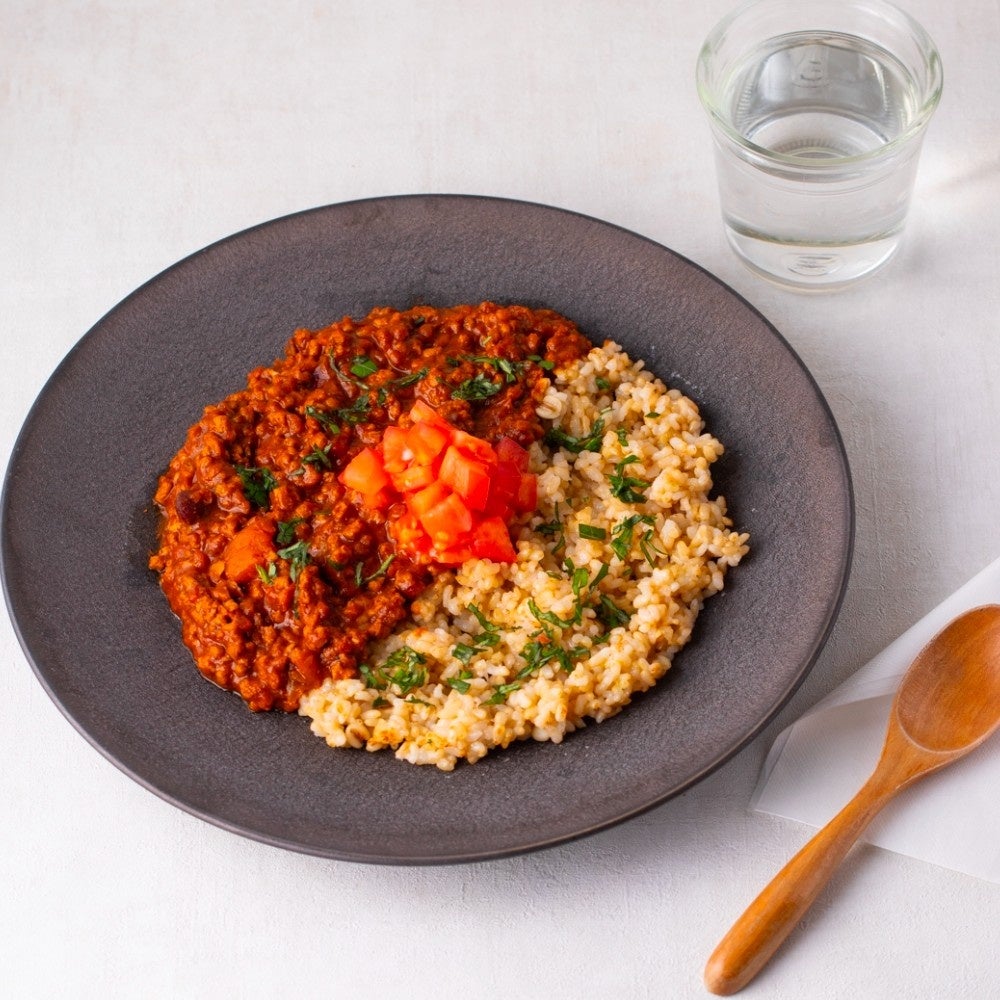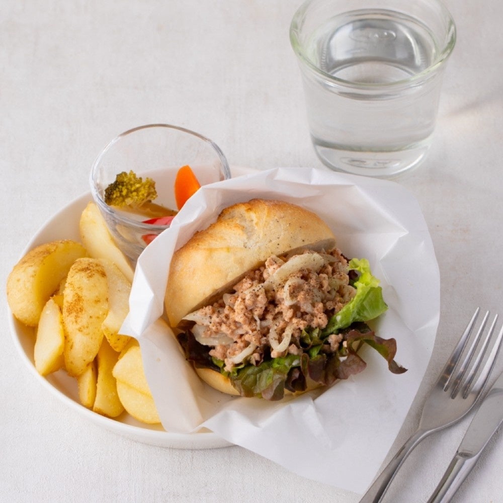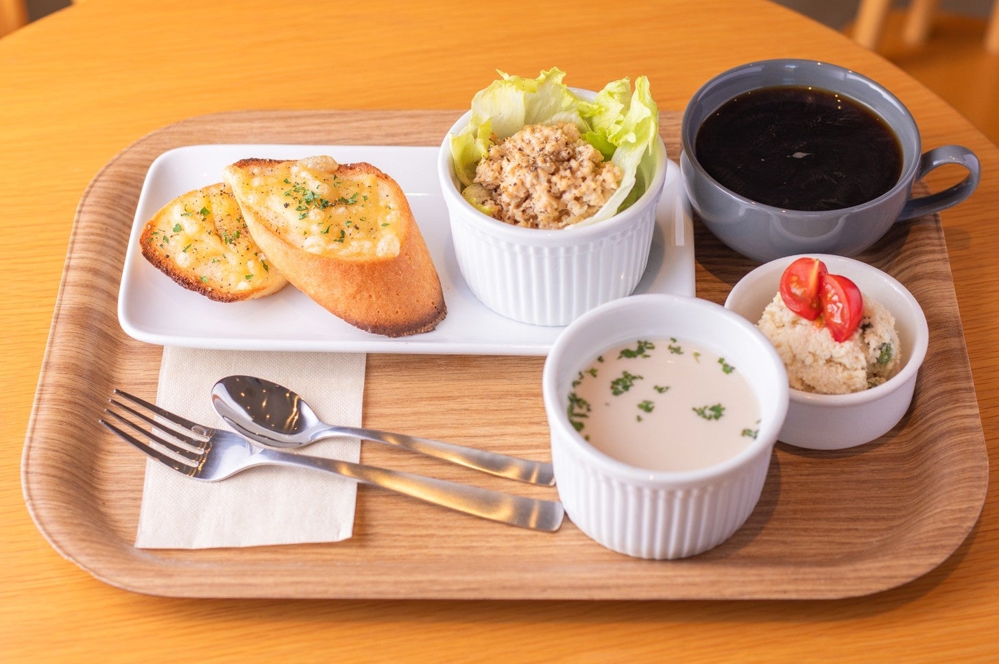 (米粉バゲット、大豆ミートデリ、おからマッシュサラダ、スープ、ドリンク)