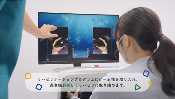 麻痺手側の画像に対してキャラクターを映し、キャラクターをキャッチさせるゲーム機能を搭載し、患者が楽しみながらリハビリテーションに取り組まれるような工夫がされています。