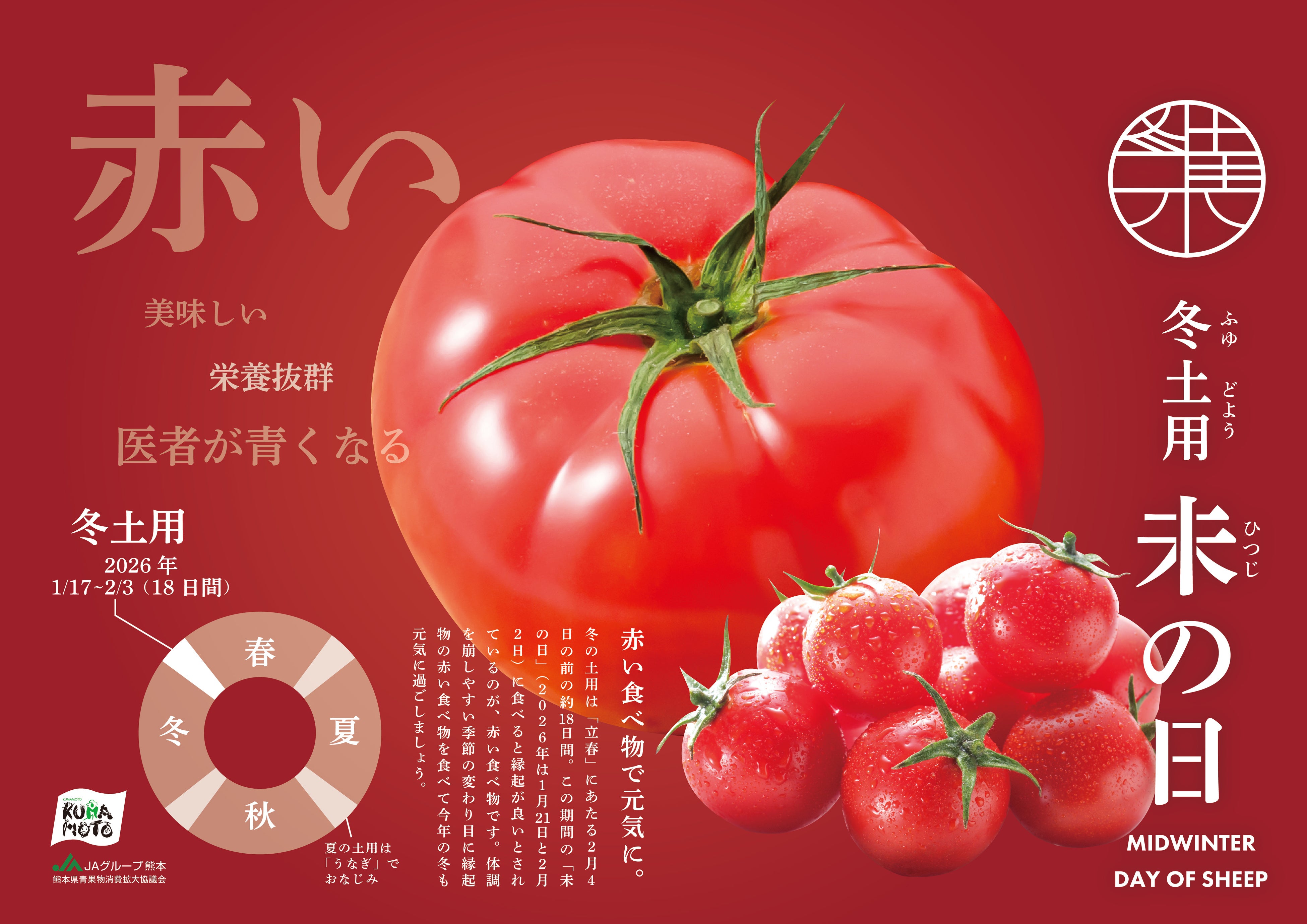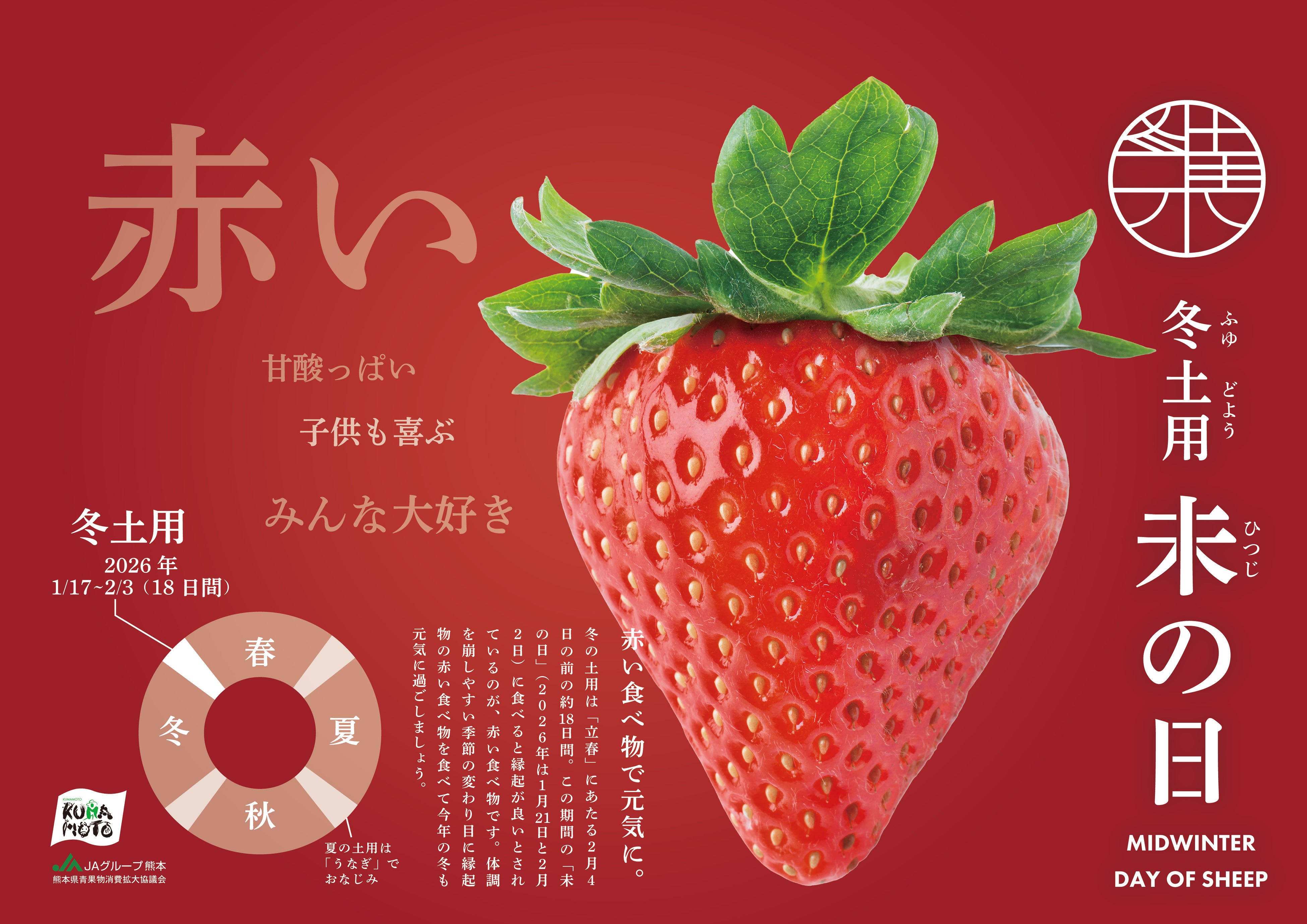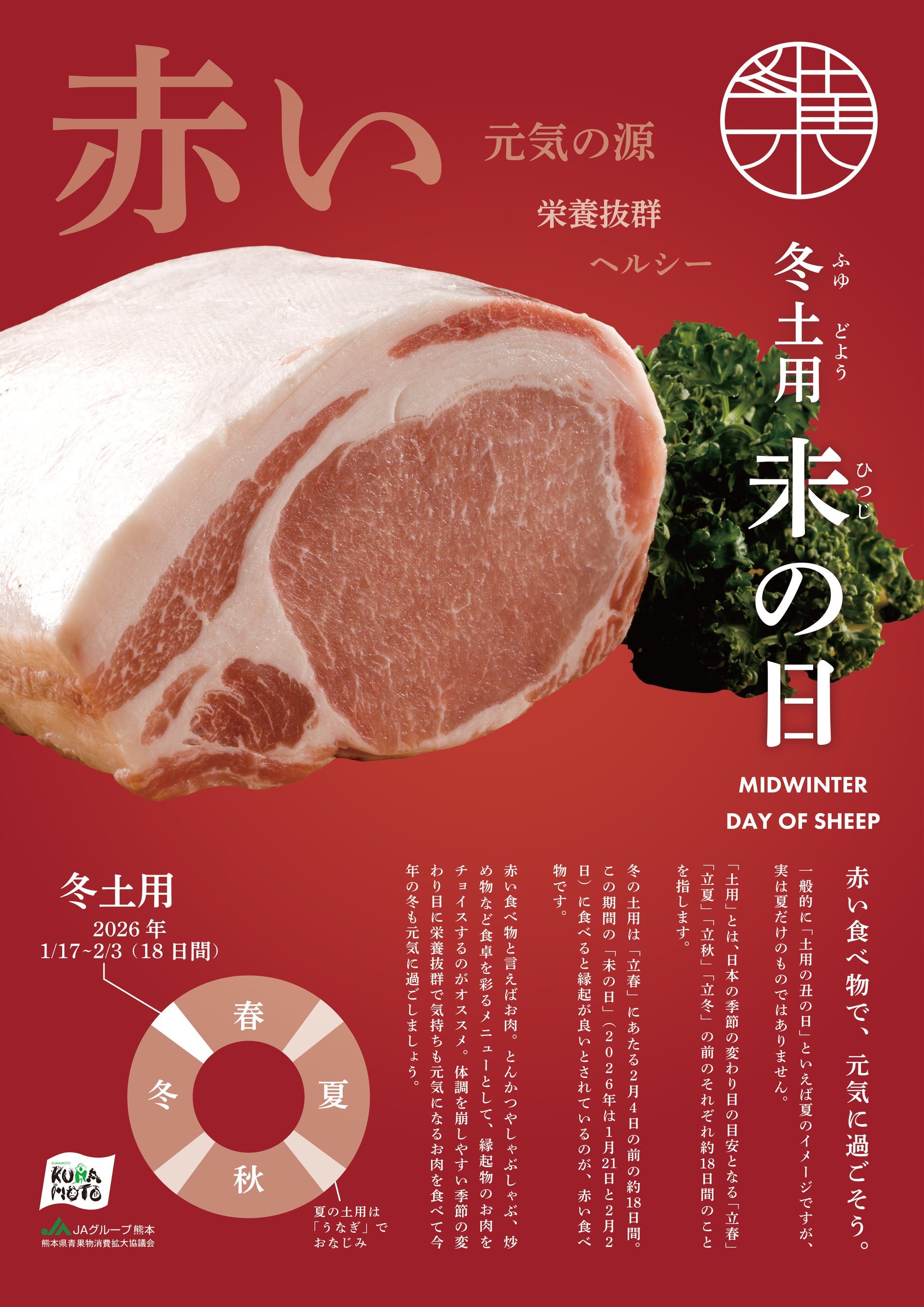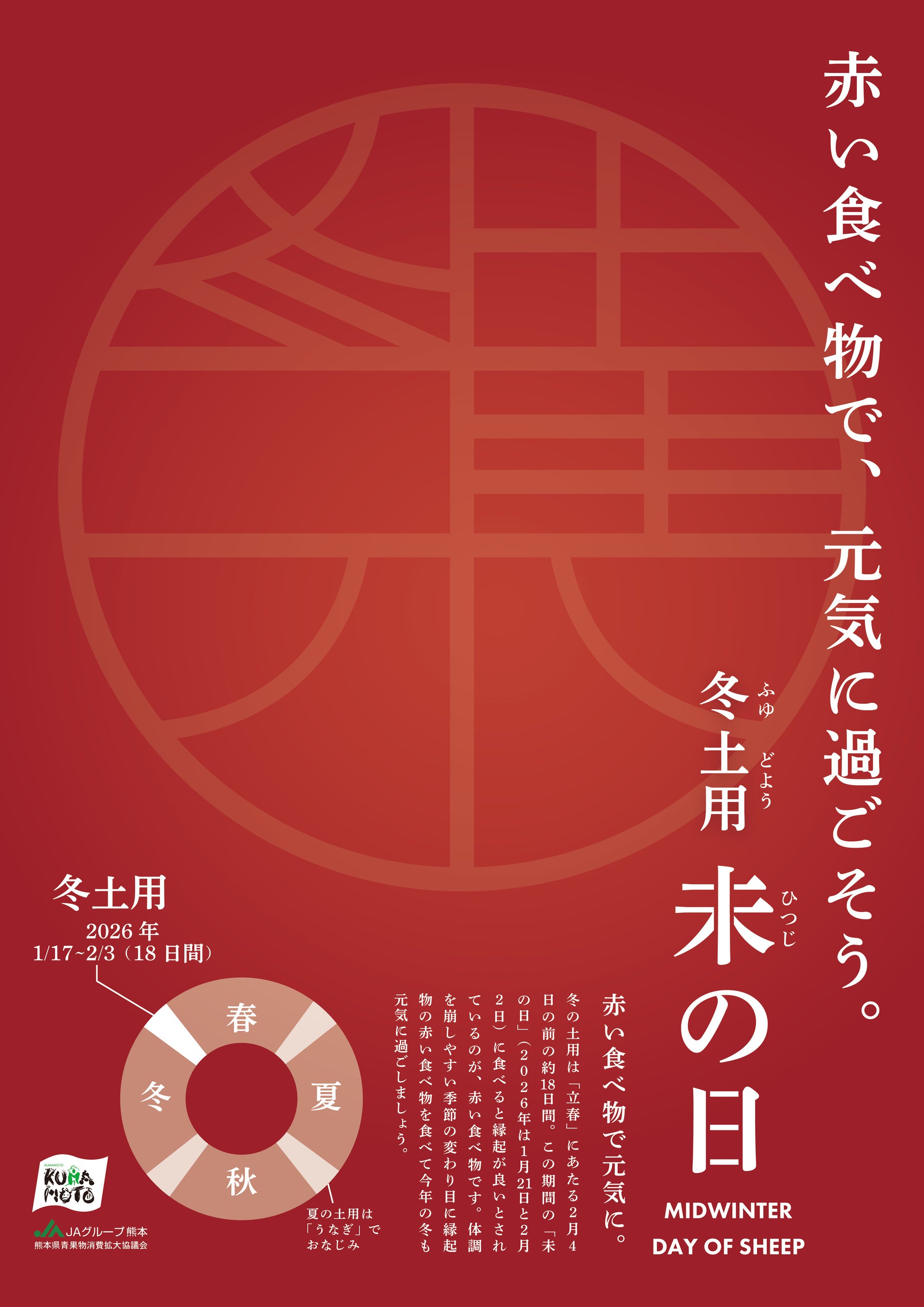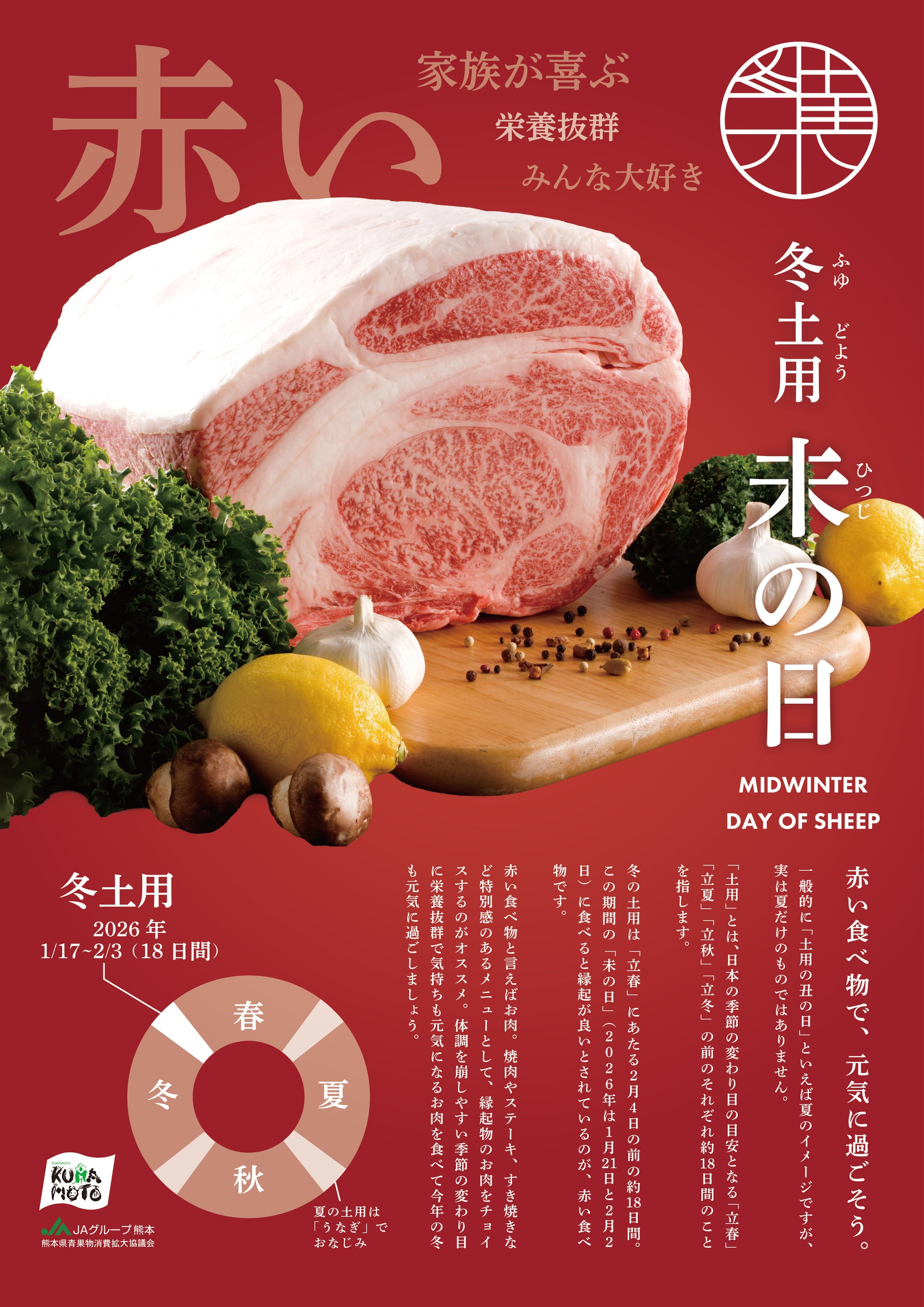 JA熊本経済連(本所:熊本県熊本市、代表理事会長:丁 道夫)は、量販店や飲食店、食品メーカーなど関係機関と連携し、古来より伝わる「冬土用未の日(ふゆどようひつじのひ)」を契機に新たなマーケットの創出を目指してまいります。