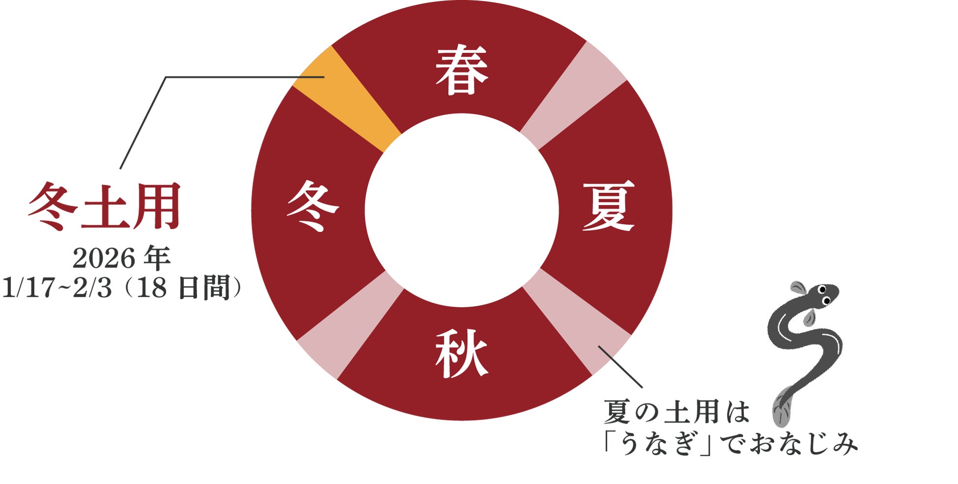 「土用の丑の日」というと一般的には夏のイメージがありますが、実は夏だけのものではないってご存じでしたか?土用とは季節の変わり目を意味し1年に4回(春・夏・秋・冬)あり、日本の季節の変わり目の目安となる「立春」「立夏」「立秋」「立冬」の前のそれぞれ約18日間のことを指します。