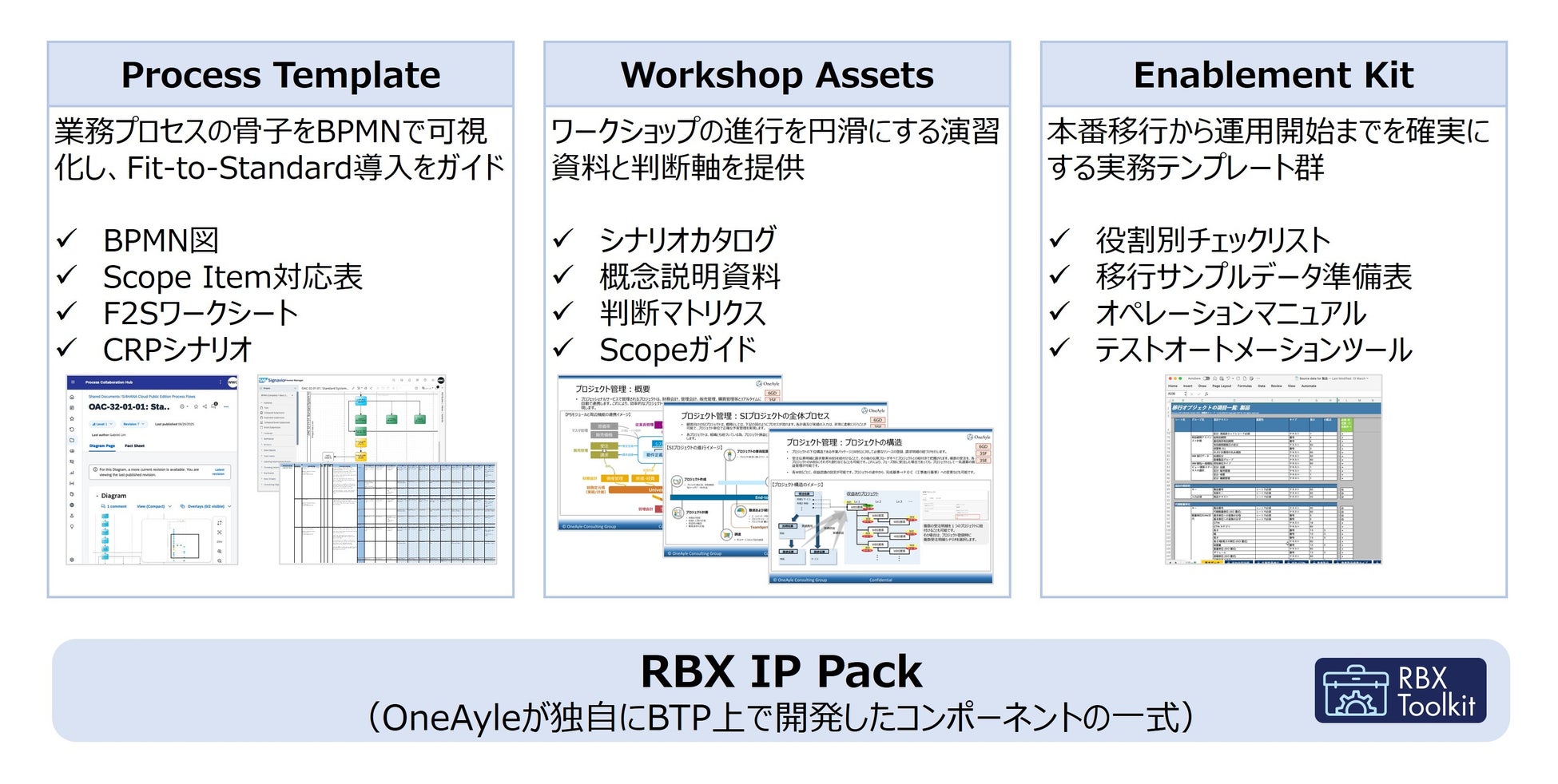 スコープ対応表/BPMN/CRPシナリオ/移行サンプル/操作マニュアルなど導入~運用を一気通貫で支えるアセット群