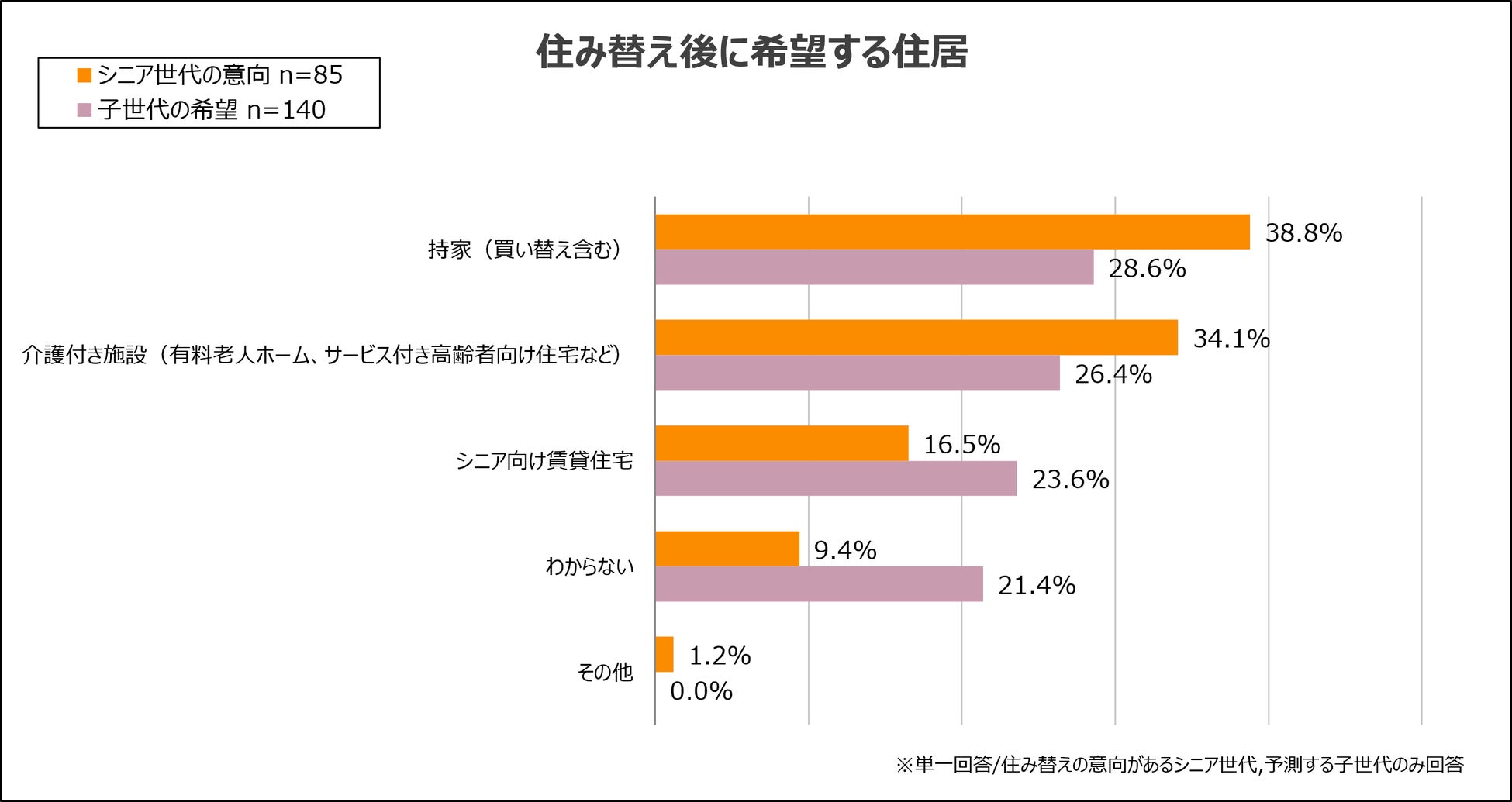 シニア世代の7割以上が「住み替える意向はない」と回答する一方で、子世代の予測とは約20%の差が見られました。子世代は親の住み替え先を比較的多様に捉えており、約4人に1人が「シニア向け賃貸住宅」を希望先として挙げています。