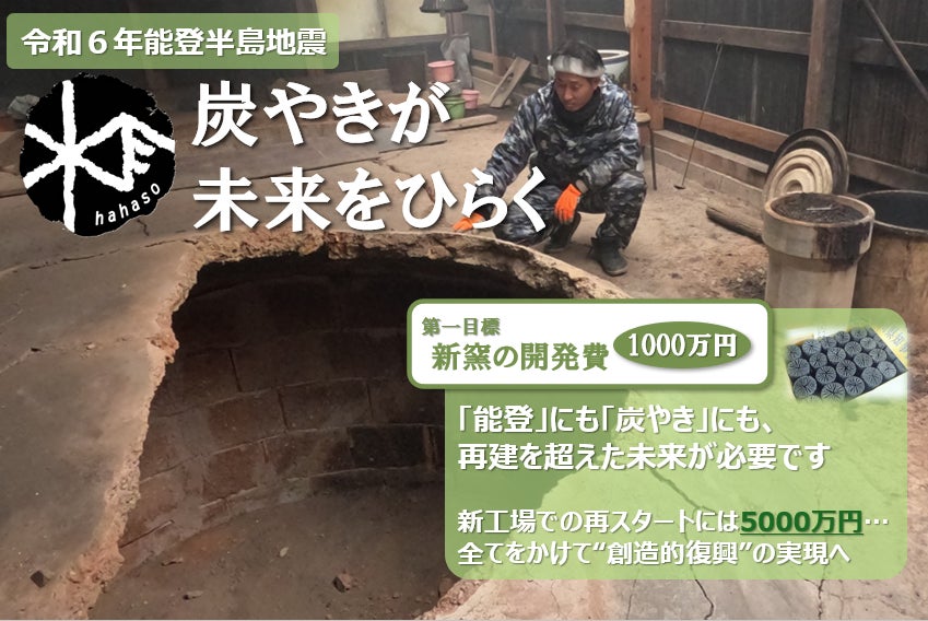 能登半島で炭やきを営む株式会社ノトハハソがクラウドファンディングを用いて地震の揺れに強い炭やき窯の開発に挑戦し、事業再建に必要な資金5,000万円の調達を目指します。