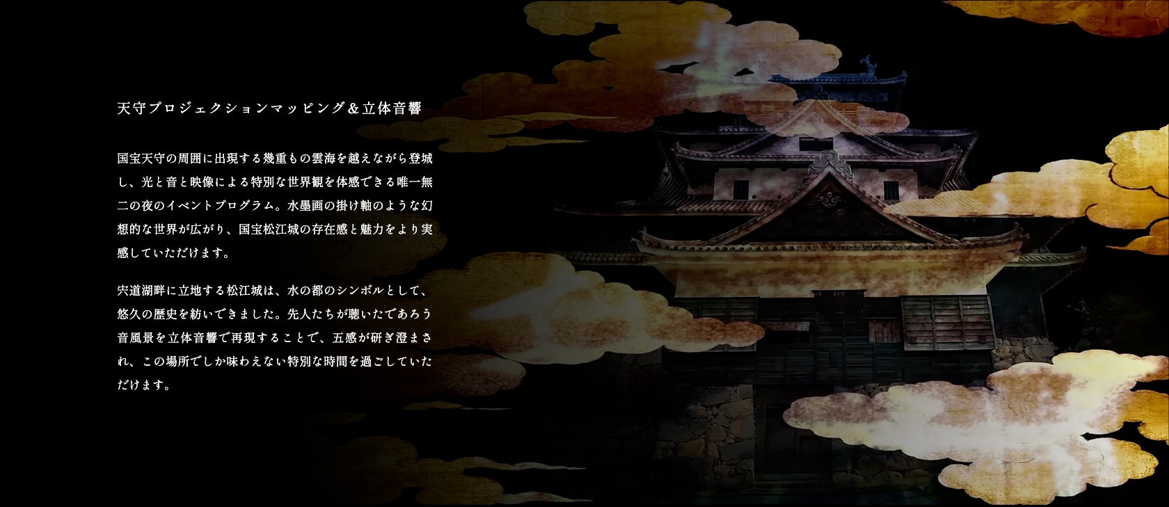 株式会社and Jam(東京都千代田区、代表 三條 龍弥)は、島根県松江市などが主催する体験型イベント「八雲立つ 雲海・松江城 ~光と詩が紡ぐ物語~」において、企画面での設計およびアイデア協力という形でプロジェクトに参画いたしました。