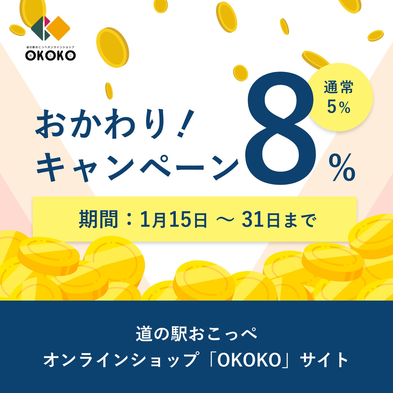道の駅オンラインショップ『OKOKO』 https://okoppe-hokkaido.jp/ でお買い物をすると料金に対して通常5%を付与されます。開催期間中『OKOKO』では購入金額に対しておかわりポイントを8%付与いたします。もちろん、今まで貯めたおかわりポイントを利用して購入もいただけます!