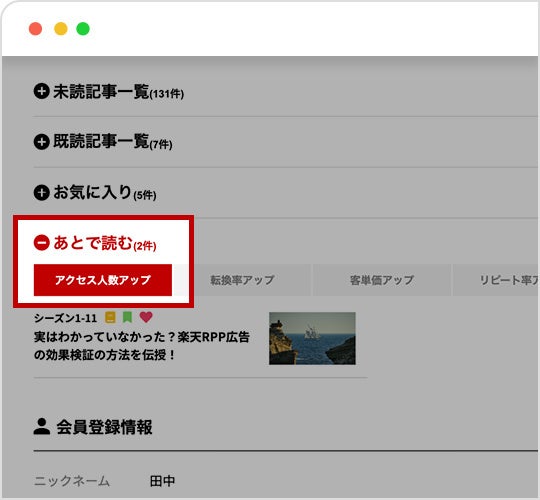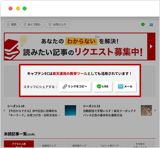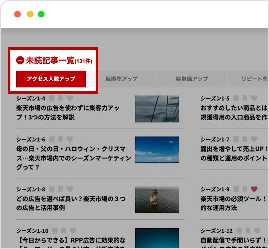 各シーズン(アクセス人数アップ・転換率アップなど)ごとに、未読の記事が一覧で表示されるようになりました。