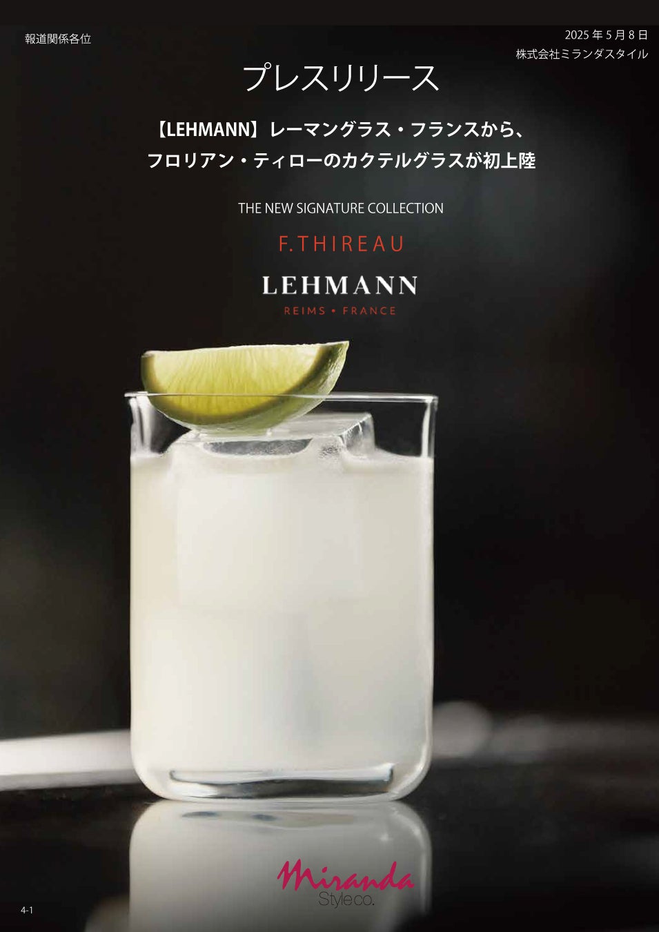株式会社ミランダスタイル(本社:栃木県宇都宮市、代表取締役:秋澤正明)は、フランスの高級グラスブランド「LEHMANN(レーマングラス)」の新作シリーズ『フロリアン・ティロー』を、2025年5月10日(土)より日本国内で発売いたします。LEHMANNは、シャンパーニュ地方を拠点とし、卓越した品質と美しいデザインで知られるガラスメーカーです。その中でもフロリアン・ティローシリーズは、カクテルグラスを中心としたコレクションであり、ミクソロジーの芸術性を引き立てる革新的なデザインが特徴です。