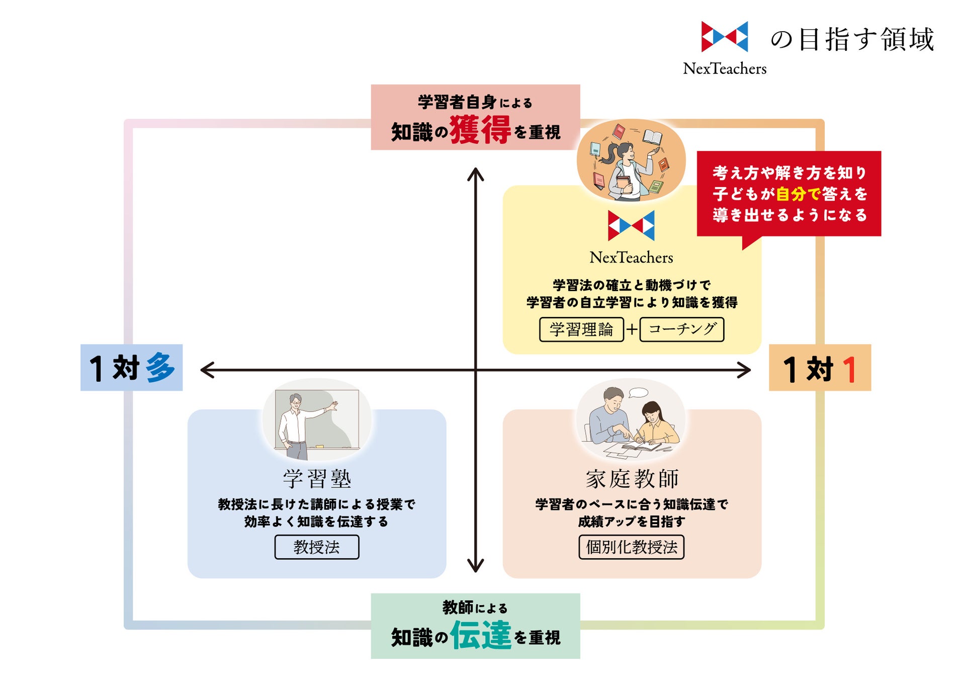 「教えない家庭教師」NexTeachersでは、コーチング型の家庭教師を提供しております。教員志望の大学生にコーチングや学習理論の研修を実施し、修了した家庭教師のみが小学生〜高校生を対象とした生徒に対して、問いかけと対話をベースにした学習指導・支援にあたるというという事業を行っています。学習理論に基づいて問いかけを重ねることで「学び方を習得する」ことを重視し、コーチングによってその習慣化を図ることが可能となります。ここでの家庭教師経験が、大学生にとっては研修で学んだコーチングや学習理論の実践の場ともなっており、そこでPDCAサイクルを回しながら実践的に学び続けることで、質の高い教員を輩出することを企図しています。