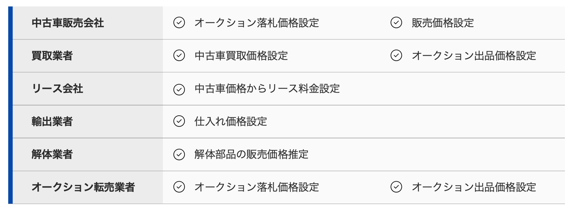 幅広い車種に対応:国内外の主要メーカーすべての車種を網羅し、査定のバラつきを解消。