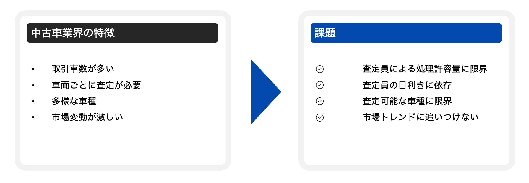 従来の査定は、査定員の経験や判断に依存し、評価がばらつく課題がありました。また、市場の変動に即応できず、適正な価格設定が困難でした。AIVALUEはこの課題を解決し、安定した査定精度と業務の効率化を実現します。