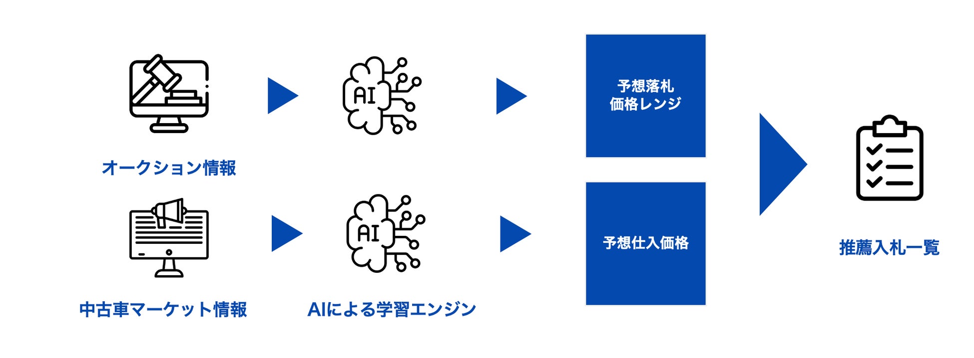 AIによる自動査定:全国のオークション出品車両を自動で査定し、利益の見込める車両を特定。