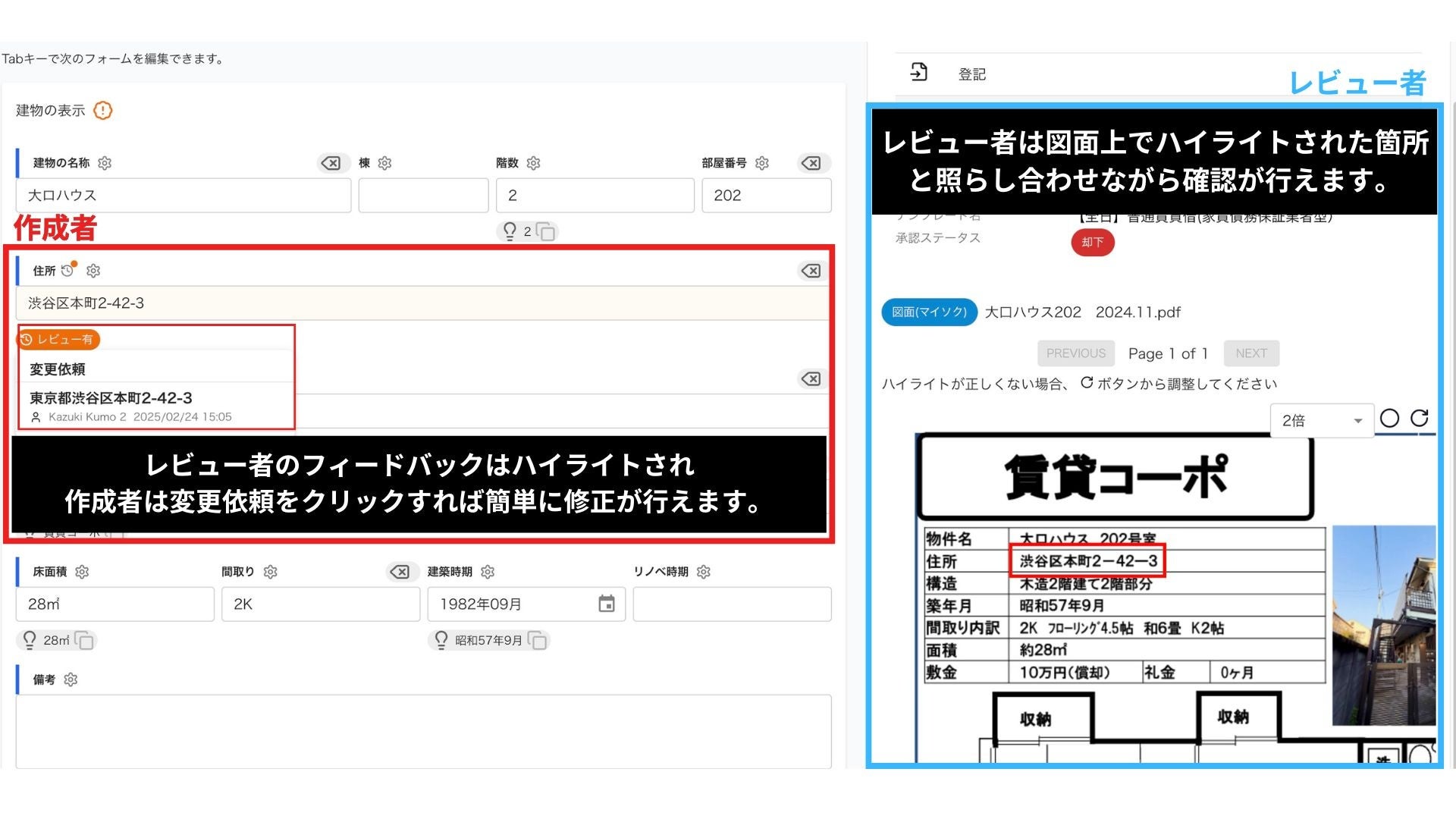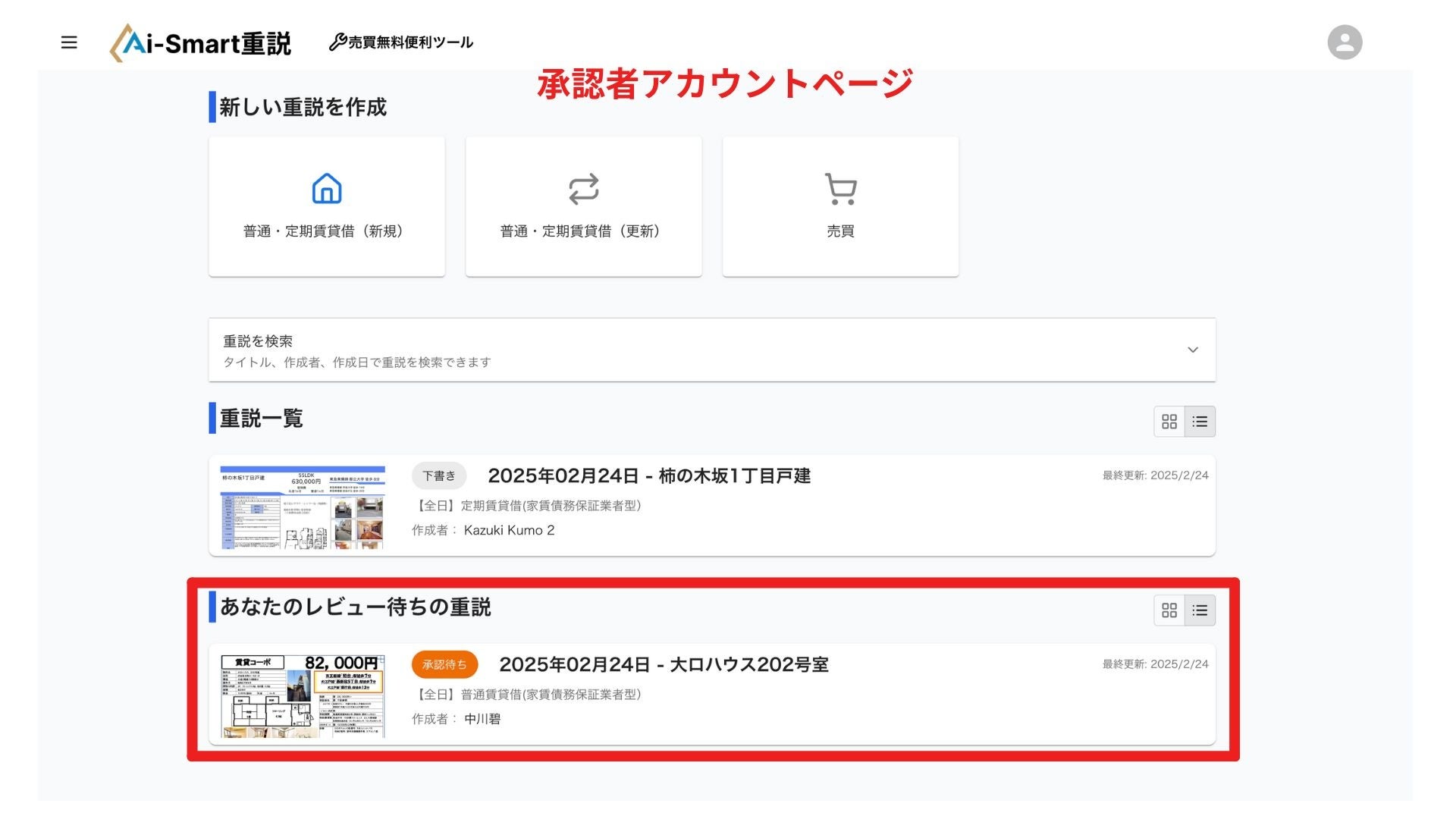 AIスマート重説内で、作成された重説の確認・編集・承認までを一元管理できる機能です。