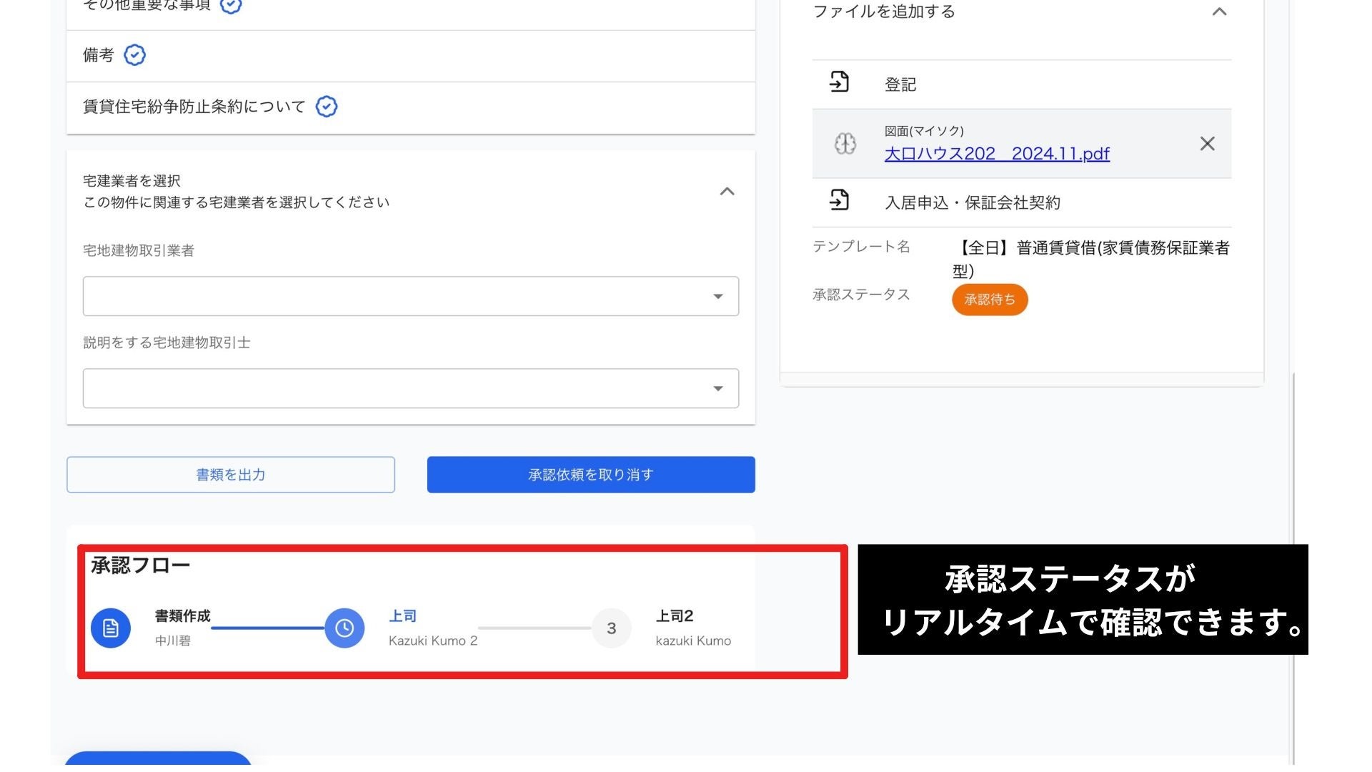 作成者は重説作成後、上長や承認者に対して承認依頼通知を送信できます。