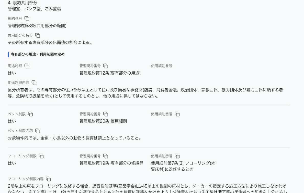 特に区分売買の重説で求められる共用部分の使用ルール、修繕積立金、ペット飼育制限などの情報を、ファイルアップロードのみで管理規約から自動で抽出するツールです。