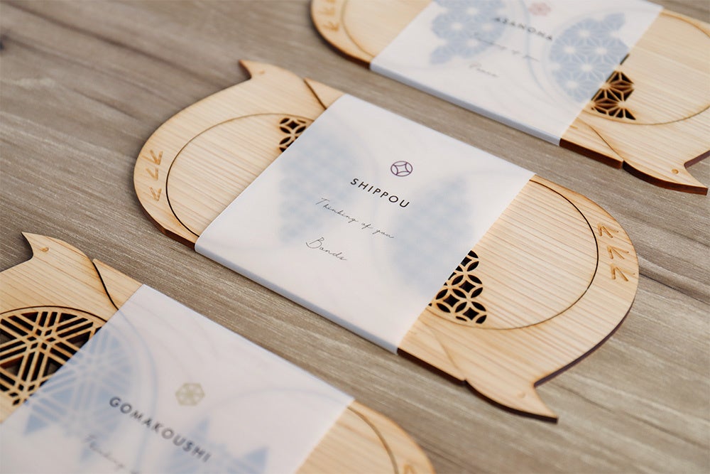 レーザー加工でくり抜かれる、コースターの「周り」も無駄なく活用するため、鍋敷きとして生まれ変わらせるアイデアを採用。さらに、熊野にゆかりのある導きの神「ヤタガラス」をモチーフに、贈り物としてぴったりな、ペアデザインを施しました。