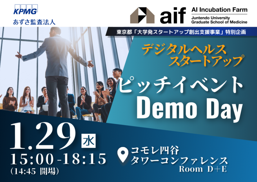 本イベントは、順天堂大学AIインキュベーションファーム(aif)とKPMGジャパンの共催により、デジタルヘルス分野の有望なスタートアップ企業が事業紹介を行う場として開催されました。