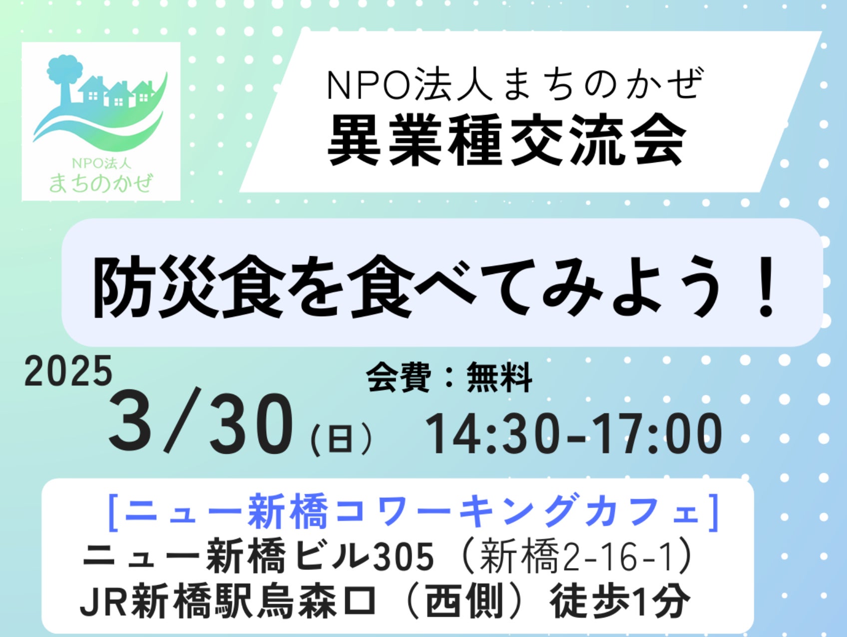 ・メール記載内容:タイトルに「3月30日防災食イベント参加希望」本文に「①氏名②職業③電話番号」を記載ください。