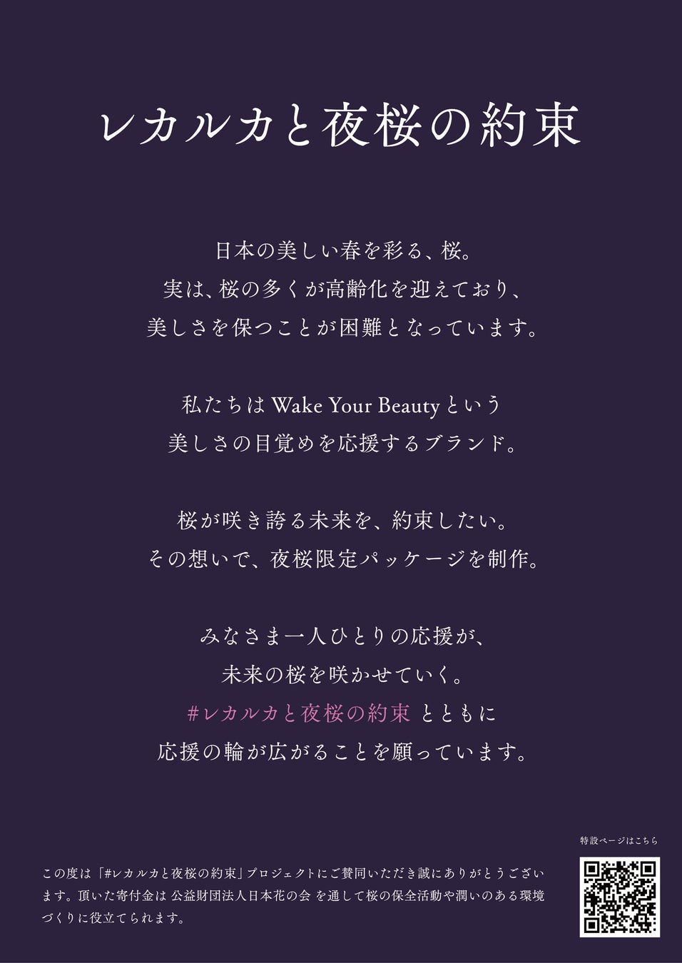 私たちレカルカは、Wake Your Beauty という美しさの目覚めを応援するブランドとして、今回の「シムセラムEX ~ 夜桜ver.~」限定パッケージの販売を通じて、美しい桜を守り、育むための支援活動を行います。売上の一部は、桜の保護活動としてサクラ類てんぐ巣病への対策と桜の植樹支援として公益財団法人日本花の会に寄付され、桜の未来を守るための研究、治療、そして新たな桜の植樹活動に役立てられます。