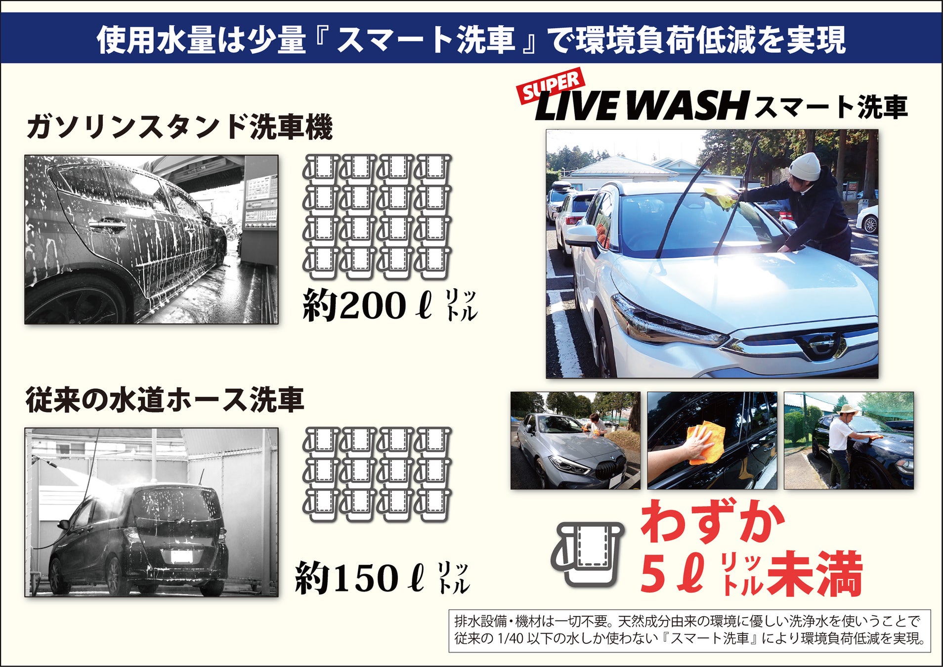 ・大量放水を必要とせず、ガソリンスタンドの洗車機と比較して1/40の使用水量、わずか5リッ