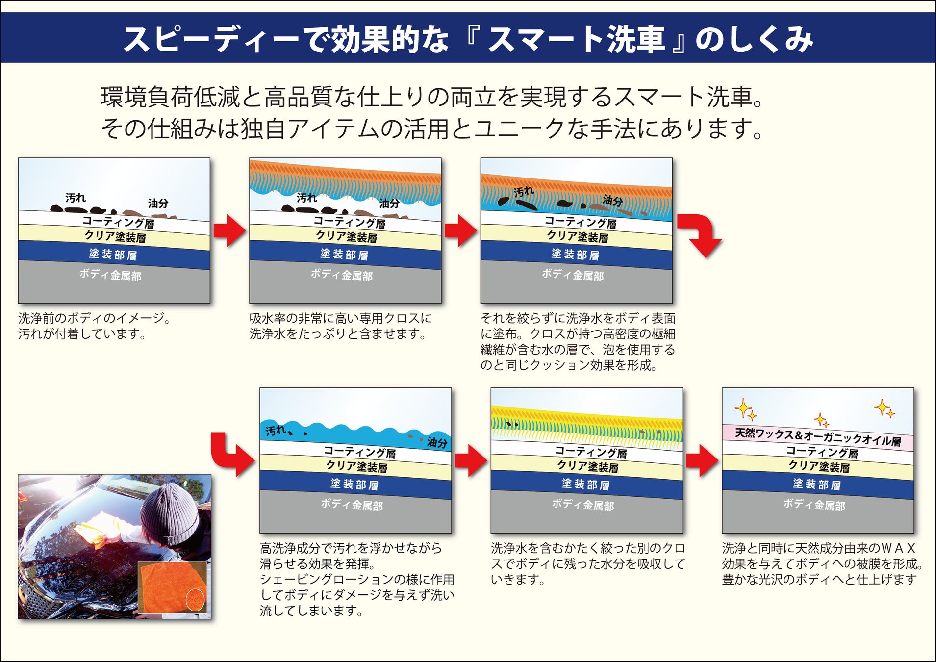その手法は、従来のガソリンスタンドや洗車専用施設などのそれとは大きく異っており、新しいスタイルの「スマート洗車」を実施。バケツ1杯未満のオリジナル洗浄水だけで短時間に来場者の愛車を極上の仕上りにするサービスを行っている。