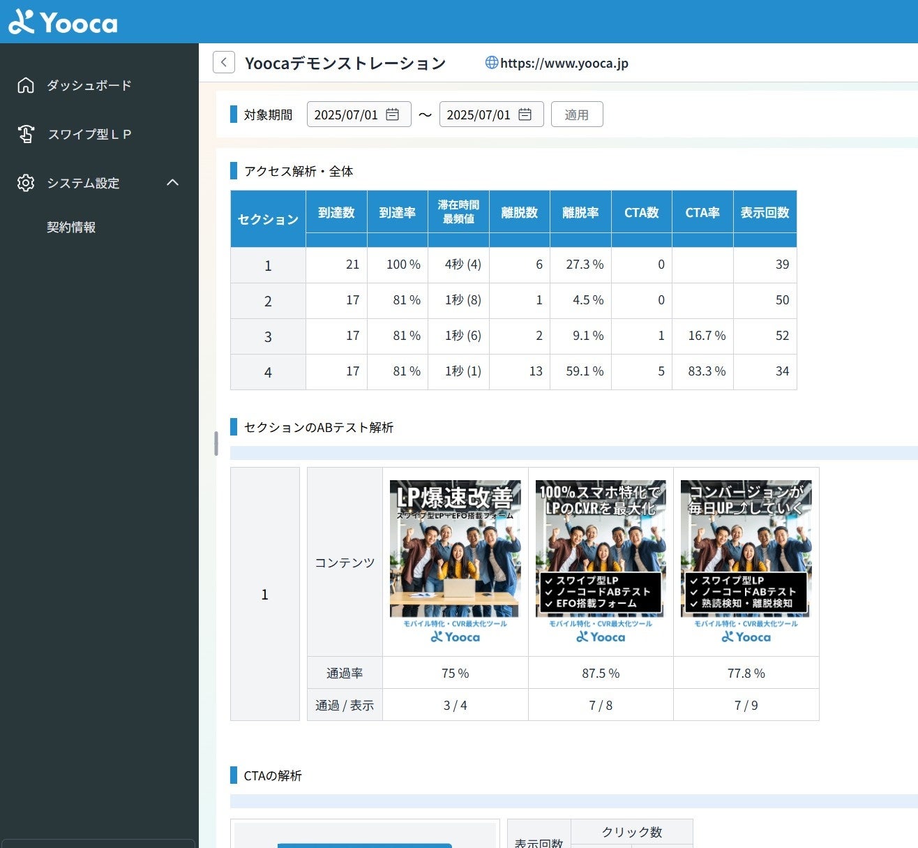 Yoocaは、画像だけで簡単にスワイプ型LPを制作でき、制作時間とコストを大幅に削減します。また、LPの「どこを改善すればよいか」を知るためのABテストやアクセス解析もノーコードで実現。「LPの改善速度と回数」が向上して、効果的な訴求方法を素早く簡単に発見できるようになるサービスです。