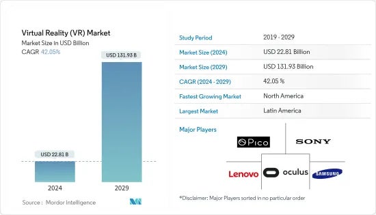 世界のバーチャルリアリティ(VR)の市場規模は、2024年に228億1,000万米ドルに達し、2024~2029年にかけてCAGR 42.05%で成長し、2029年には1,319億3,000万米ドルに達すると予測されています。