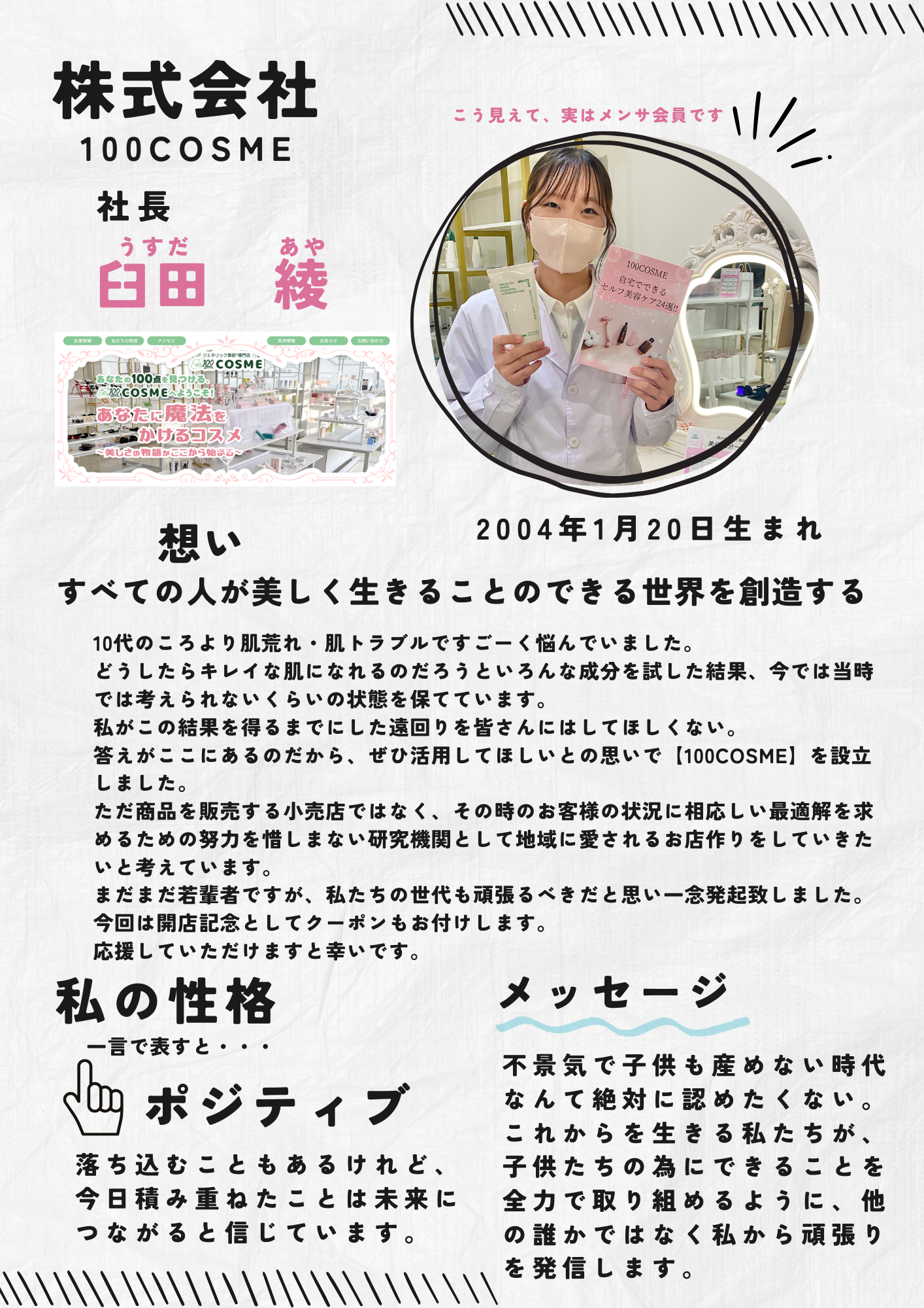 「他者を尊重できる多様性こそ美しい」。愛知県安城市を本拠とするコスメショップ100COSME、21歳社長が、この言葉を実践すべく国内最大規模のミスコンテスト「ベストオブミス」への出場を表明しました。