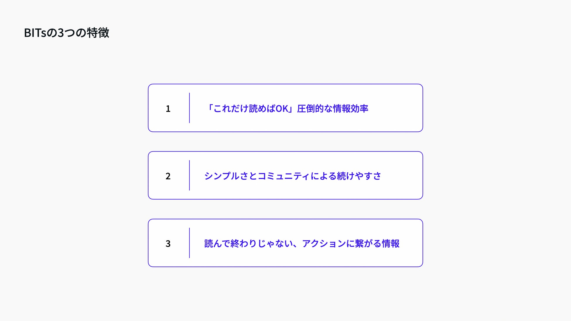 BITsは、以下の3つのポイントであなたのインプットを最適化し、成果に繋げるためのメンバーシップです。