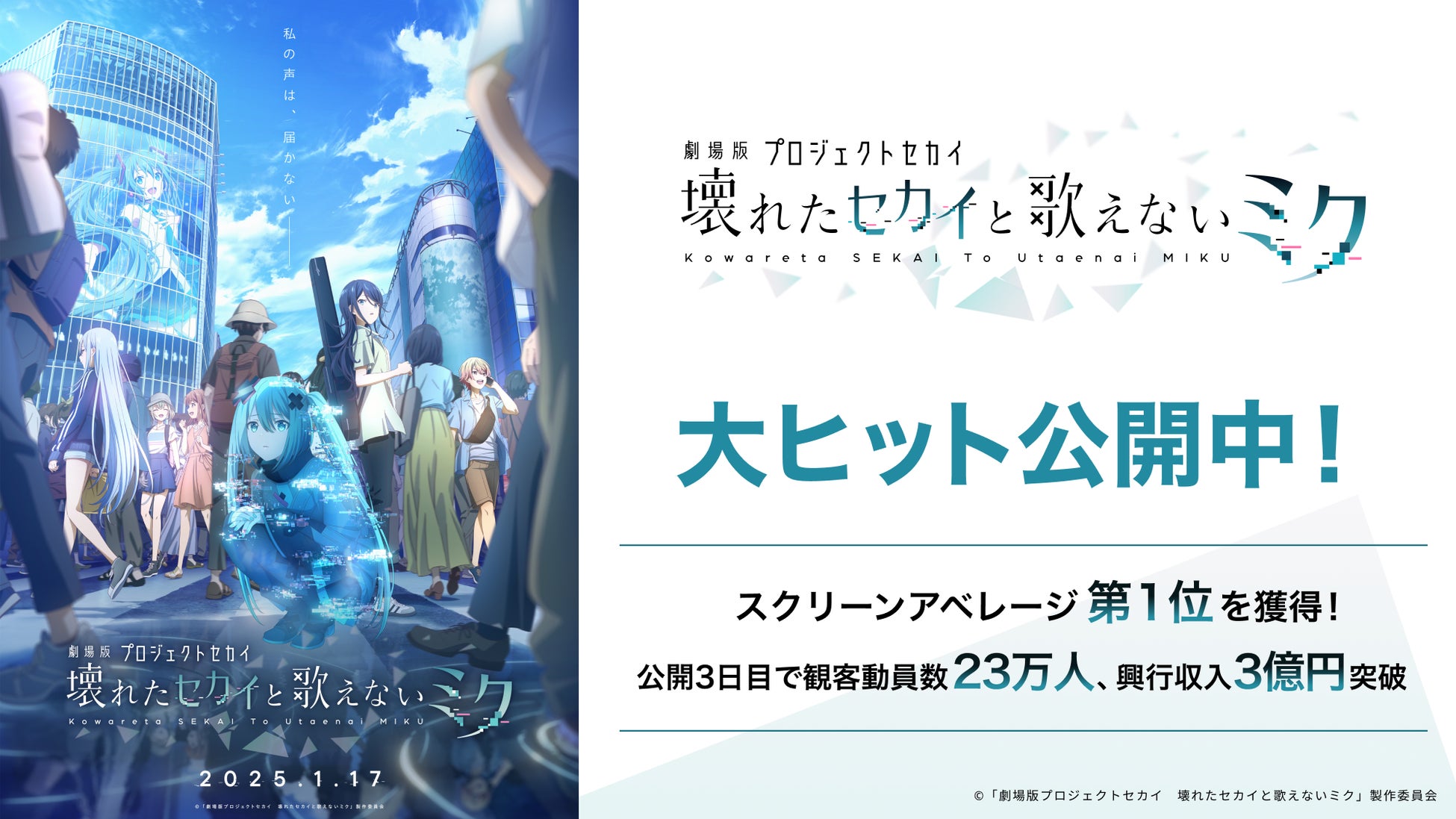 株式会社サイバーエージェント(本社:東京都渋谷区、代表取締役:藤田晋、東証プライム市場:証券コード 4751)は、連結子会社である株式会社 Colorful Palette(本社:東京都渋谷区、代表取締役社長:近藤裕一郎)と、株式会社セガ(本社:東京都品川区、代表取締役 社長執行役員 COO:内海州史)との協業による、リズム&アドベンチャーゲーム「プロジェクトセカイ カラフルステージ! feat. 初音ミク」初のアニメ映画『劇場版プロジェクトセカイ 壊れたセカイと歌えないミク』が、スクリーンアベレージ(1スクリーンあたりの興行収入)にて第一位を獲得したことをお知らせいたします。また、公開初週3日目の1月19日までで観客動員数は23万人、興行収入は3億円を突破いたしました。