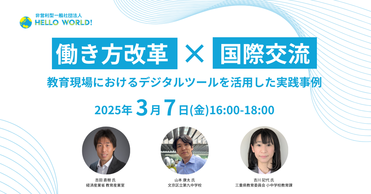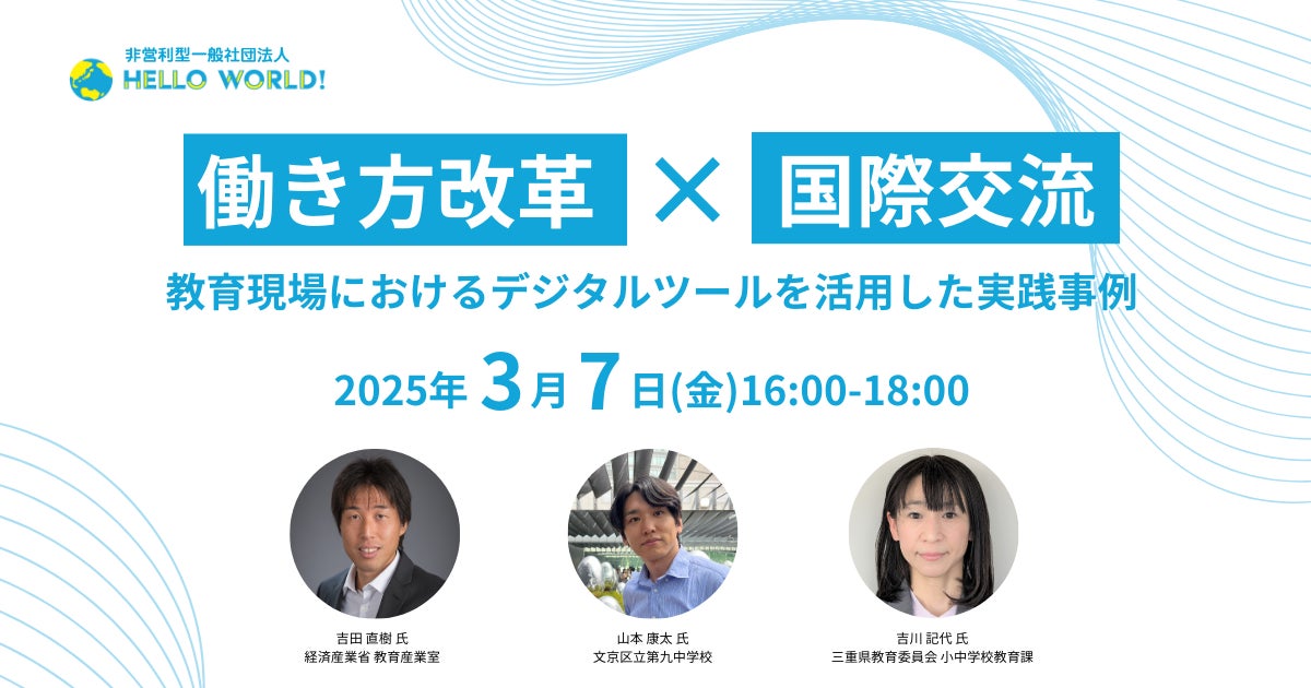 非営利型一般社団法人HelloWorld(所在地:沖縄県沖縄市、代表理事:野中 光・冨田 啓輔)は、「働き方改革 × 国際交流」をテーマに、デジタルツールを活用した新しい教育を企画・実践している有識者や教育関係者が登壇する事例紹介セミナーを、沖縄会場およびオンライン(Zoom)で開催いたします。