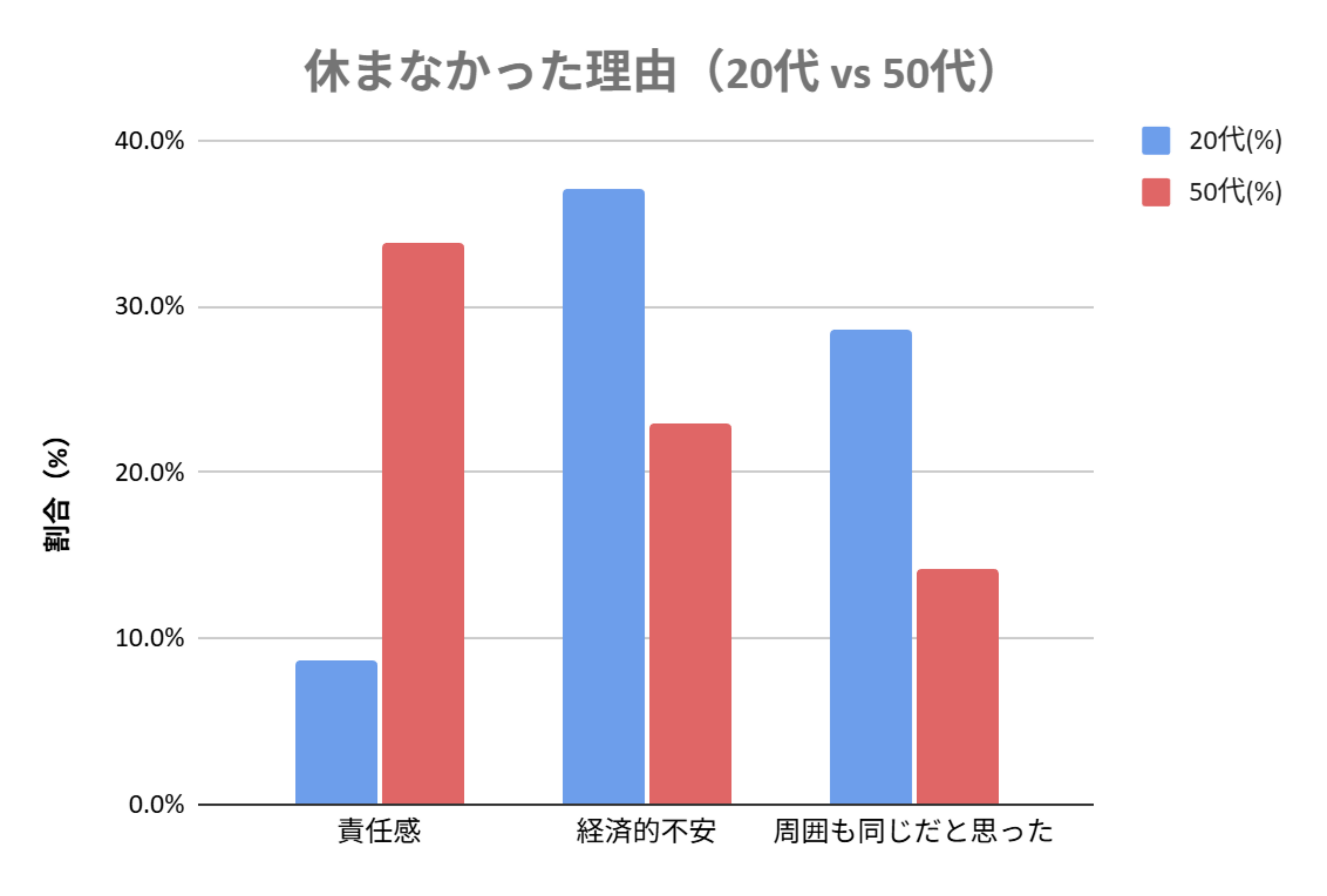 休まなかった最大の理由を年代別に分析したところ、興味深い傾向が見られました。