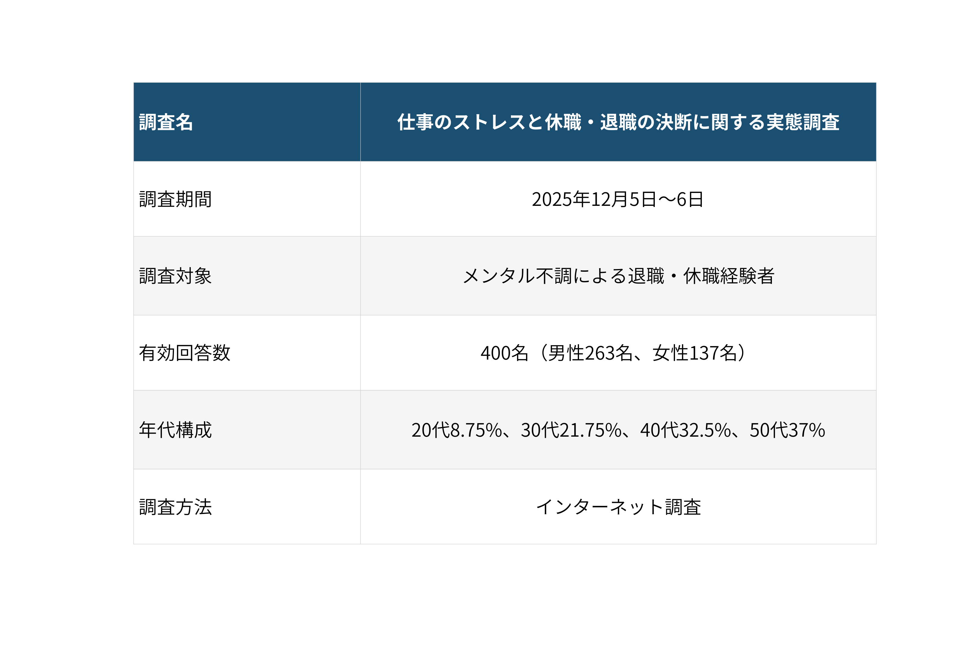 現役医師が運営する退職・給付金サポートサービス「TEATE(テアテ)」(本社:東京都中央区、代表医師:宗 大貴)は、メンタル不調による退職・休職経験者400名を対象に「仕事のストレスと休職・退職の決断に関する実態調査」を実施しました。